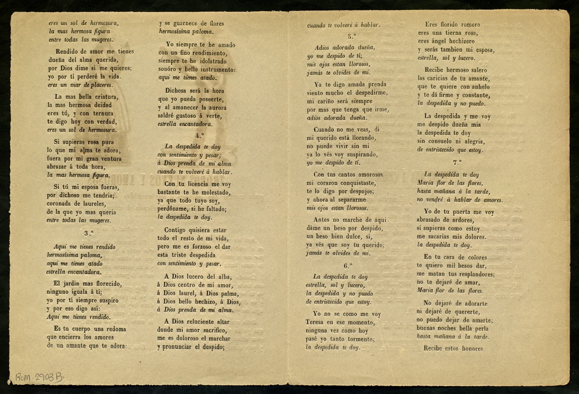 [Ferrer, Josep (àlies Queri)]. (1862) "Trobos nuevos y amorosos : para cantar los galanes á sus queridas damas ; Americana á coro". Centre de Documentació de Cultura Popular. <http://hdl.handle.net/10687/292529>. [Consulta: ]