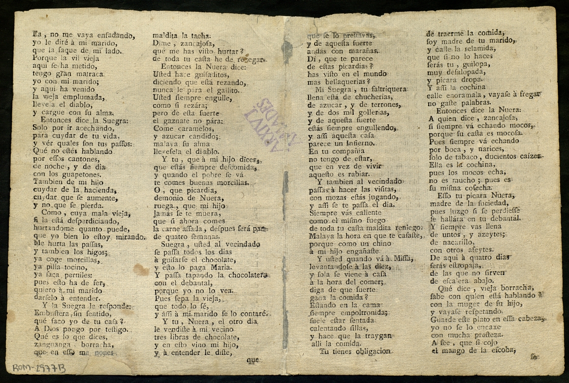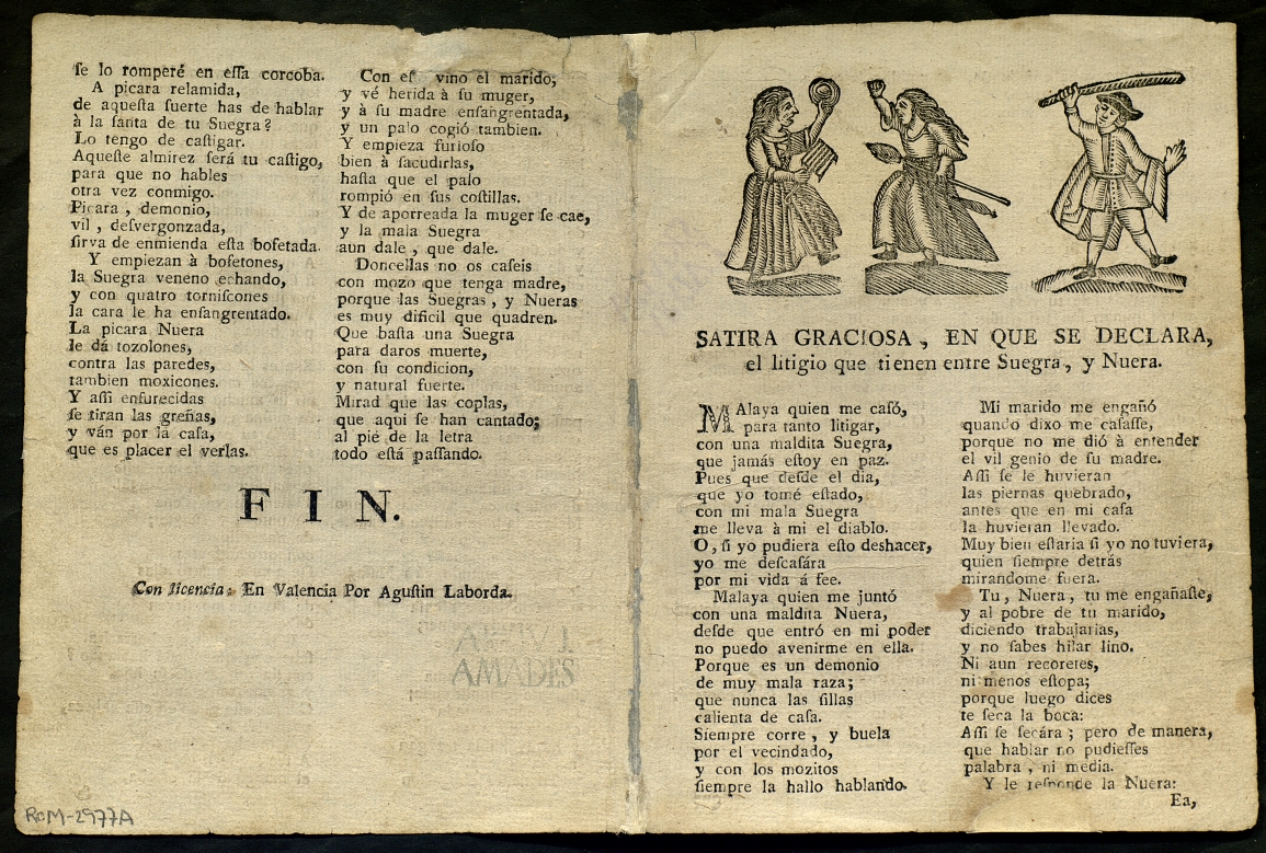 ([18-) "Satira graciosa, en que se declara, el litigio que tienen entre Suegra, y Nuera". Centre de Documentació de Cultura Popular. <http://hdl.handle.net/10687/292610>. [Consulta: ]