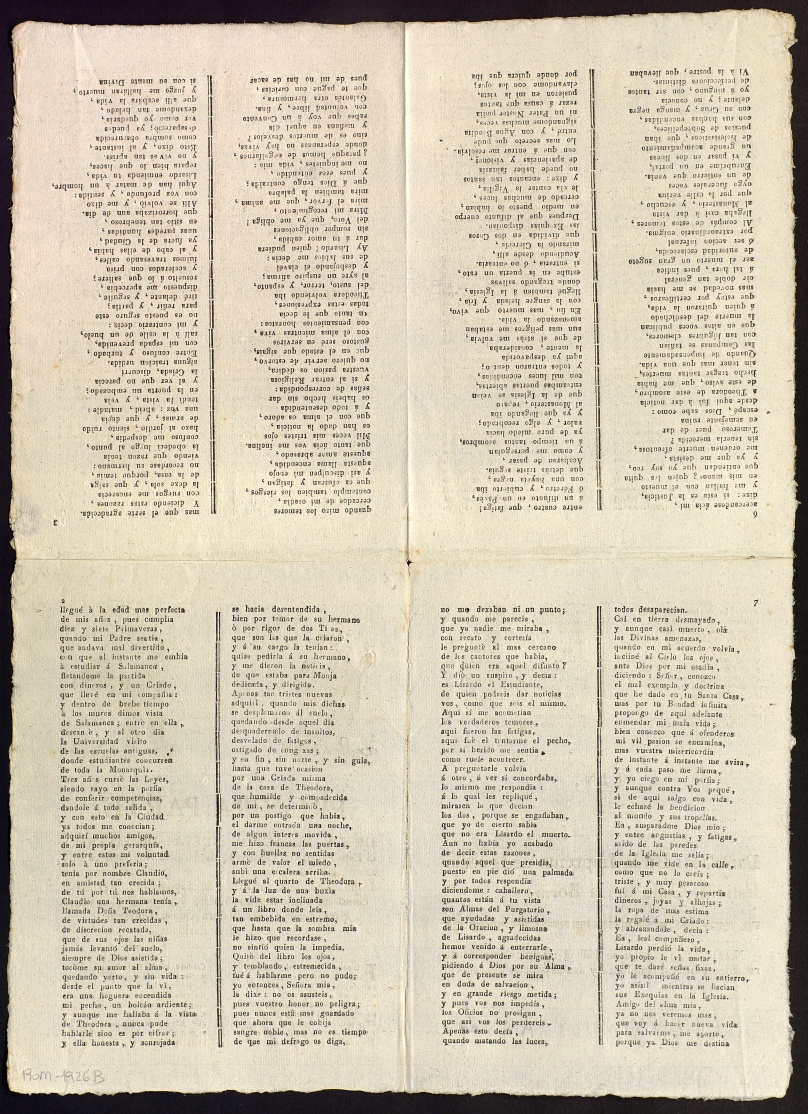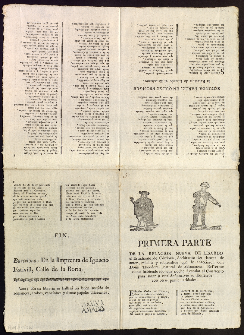 Romanço de gran format. Dos gravats xilogràfic a la capçalera. Text a dues columnes separades per corondell. Ornamentació al final del text. Estat de conservació bo, si bé té petites taques i està embrutit per la zona dels plecs i fatigat pels marges. Paper verjurat.