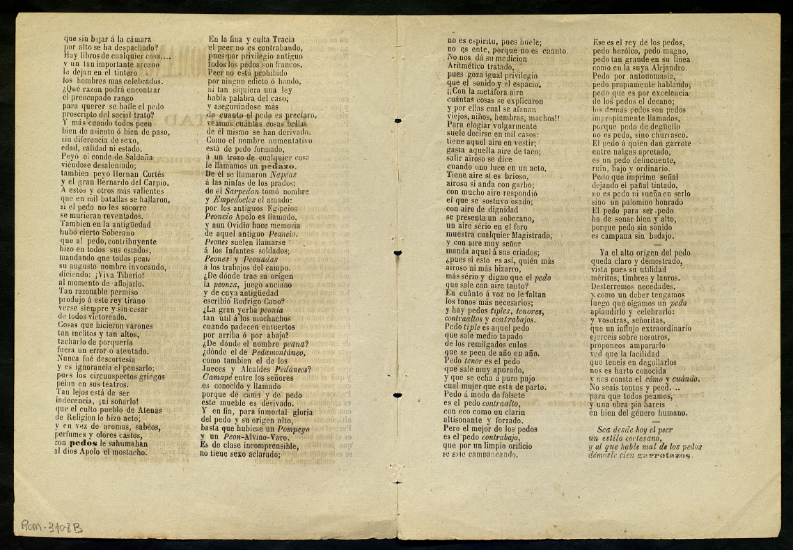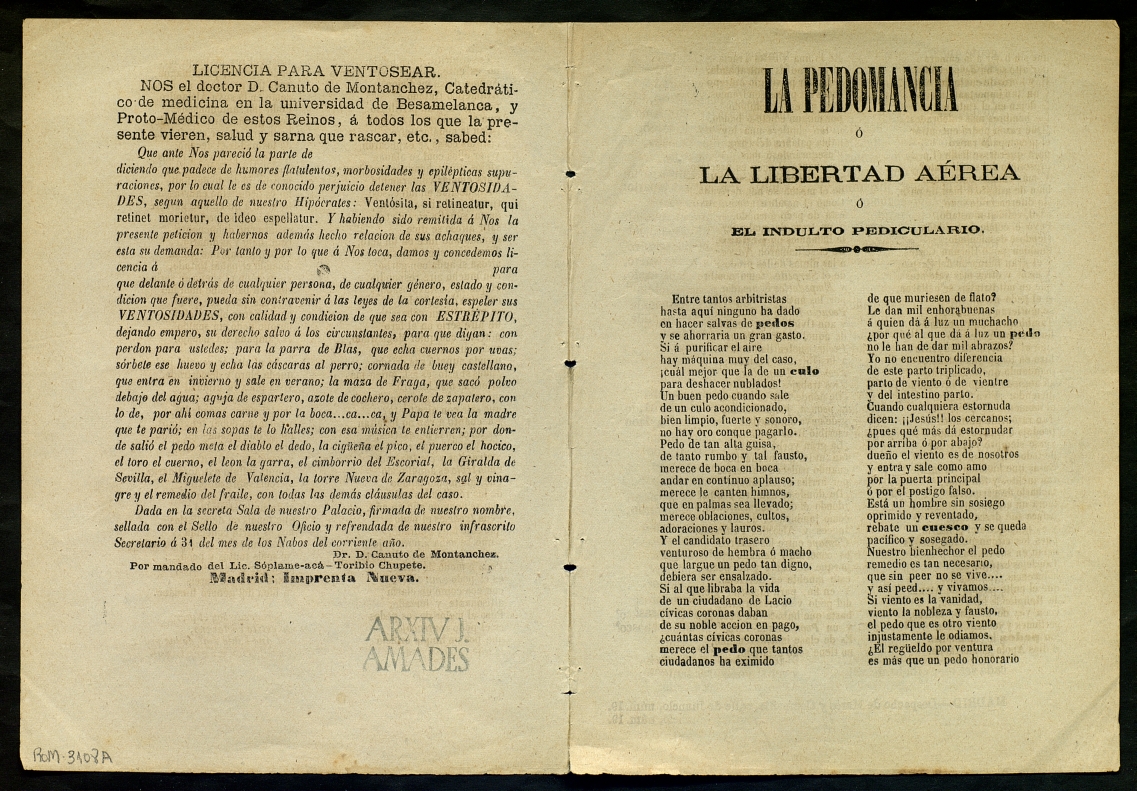 ([18-) "La pedomancia : ó la libertad aérea : ó el indulto pediculario ; Licencia para ventosear". Centre de Documentació de Cultura Popular. <http://hdl.handle.net/10687/292756>. [Consulta: ]