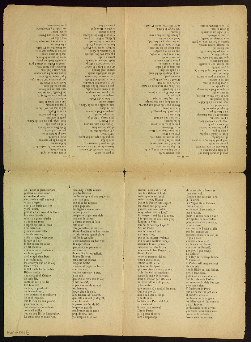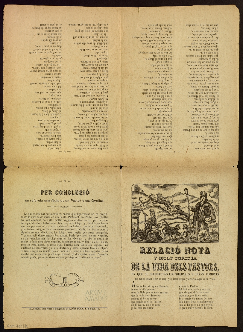 ([18-) "Relació nova y molt curiosa : de la vida dels pastors : en que se manifestan los treballs y grans combats que tenen quant los ix lo Llop, y lo molt alegre y divertida que es llur vida ; Per concusió : se refereix una fàula de un Pastor y sas Ovellas". Centre de Documentació de Cultura Popular. <http://hdl.handle.net/10687/292847>. [Consulta: ]
