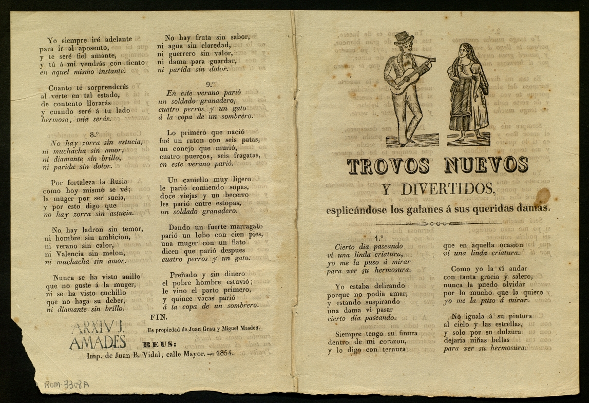 (1854) "Trovos nuevos y divertidos : esplicándose los galanes á sus queridas damas". Centre de Documentació de Cultura Popular. <http://hdl.handle.net/10687/292977>. [Consulta: ]