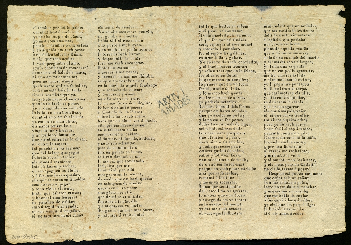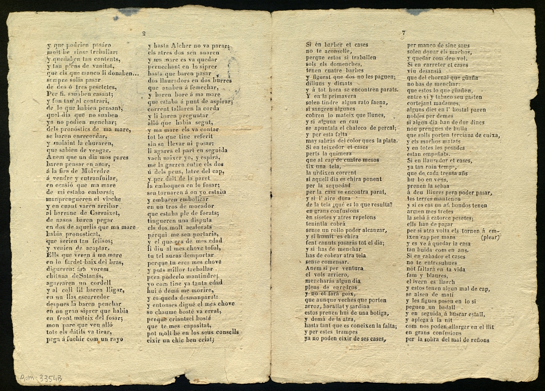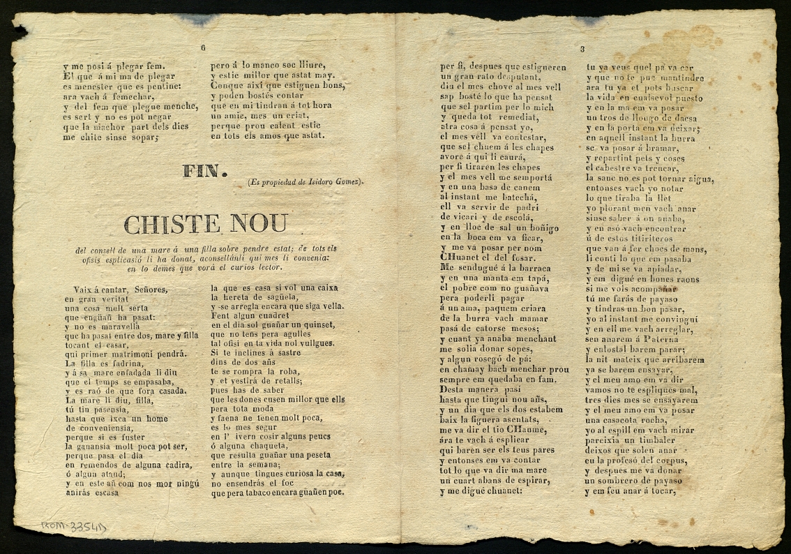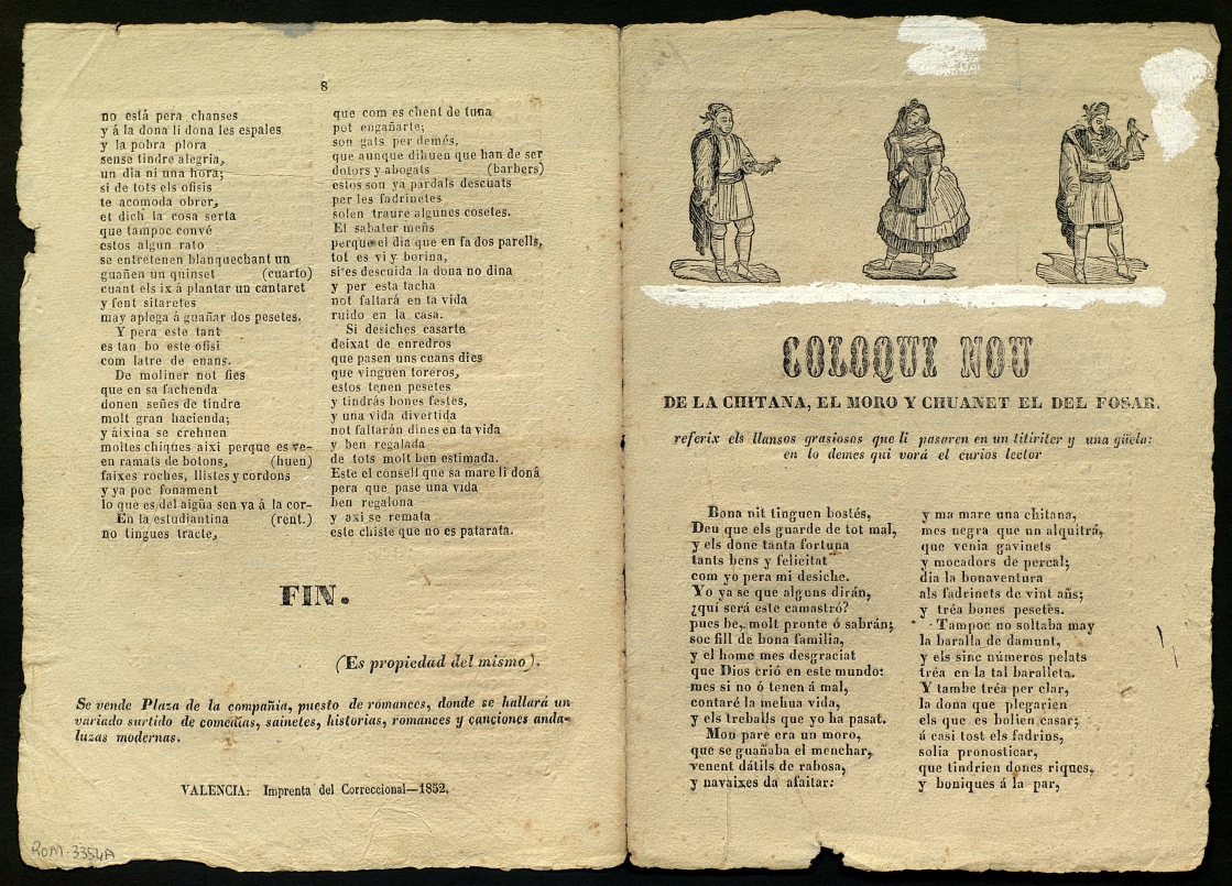 (1852) "Coloqui nou : de la chitana, el moro y Chuanet el del fosar ; Chiste nou". Centre de Documentació de Cultura Popular. <http://hdl.handle.net/10687/293027>. [Consulta: ]
