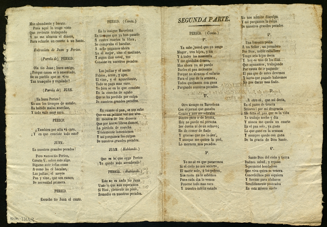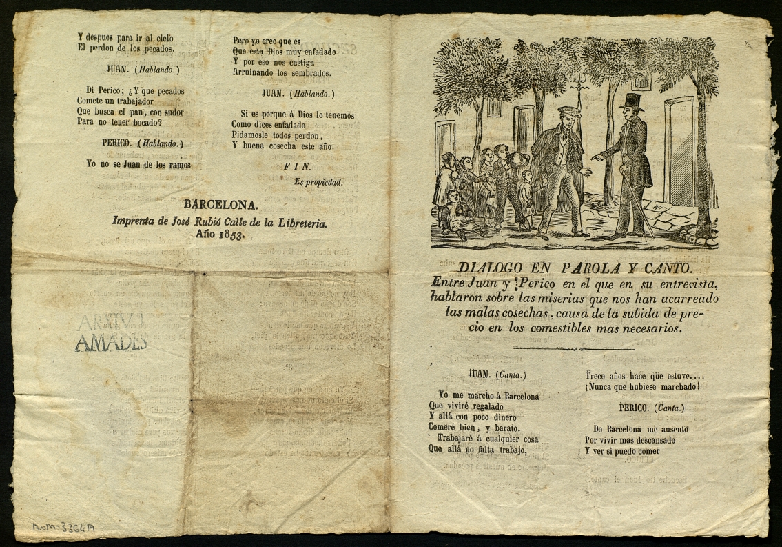 "Entre Juan y Perico en el que en su entrevista, hablaron sobre las miserias que nos han acarreado las malas cosechas, causa de la subida de precio en los comestibles mas necesarios"