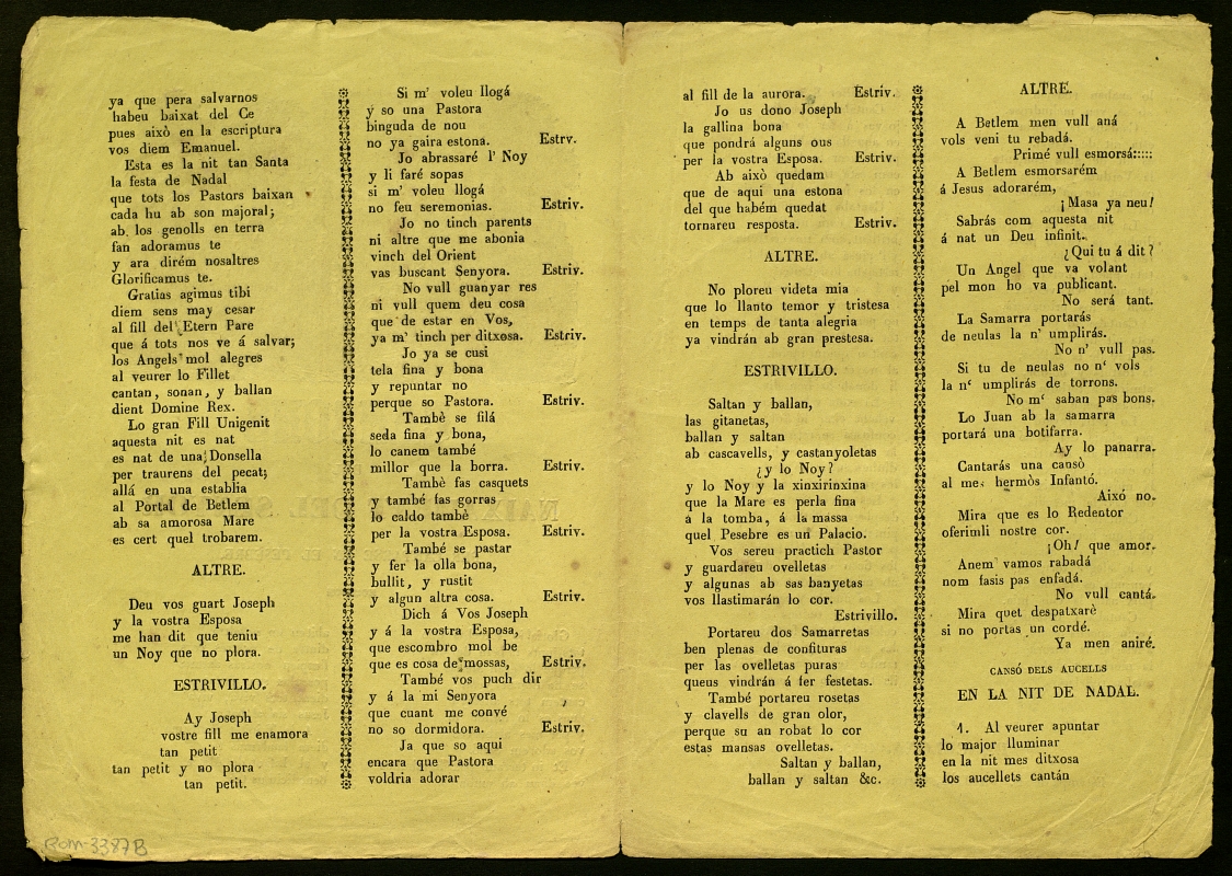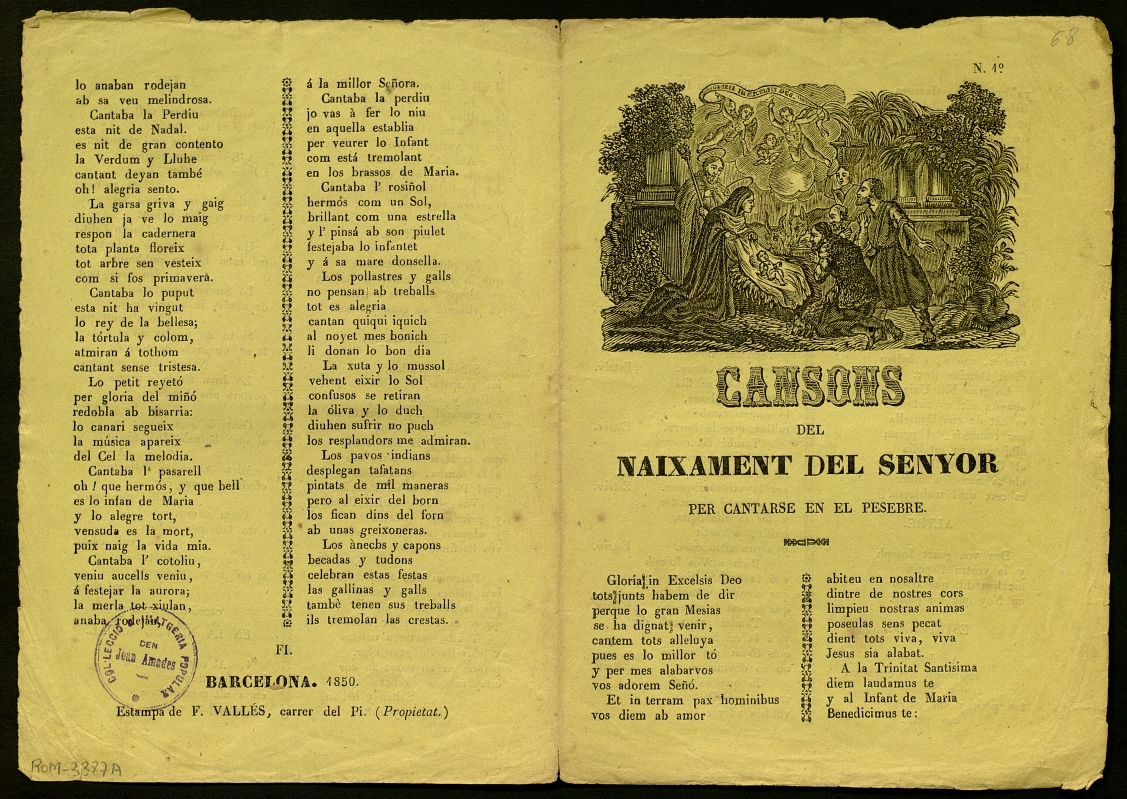 (1850) "Cansons del naixament del senyor per cantarse en el pesebre". Centre de Documentació de Cultura Popular. <http://hdl.handle.net/10687/293064>. [Consulta: ]