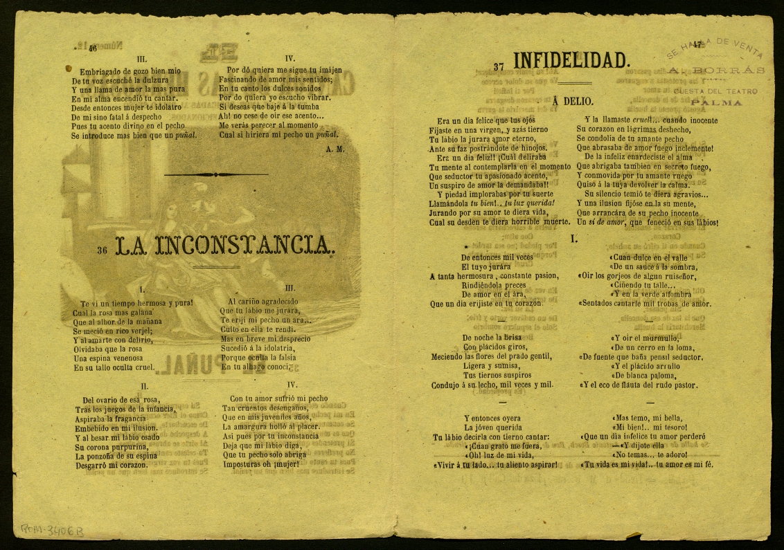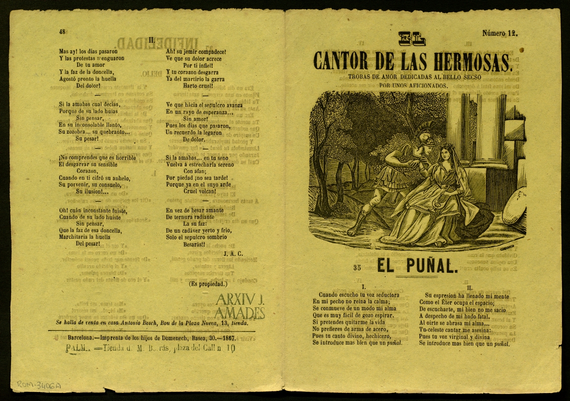 Clavé, Josep Anselm. (1867) "El Cantor de las hermosas : Trovas de amor dedicadas al bello secso por unos aficionados ; El puñal ; La inconstancia ; Infidelidad : á delio". Centre de Documentació de Cultura Popular. <http://hdl.handle.net/10687/293084>. [Consulta: ]