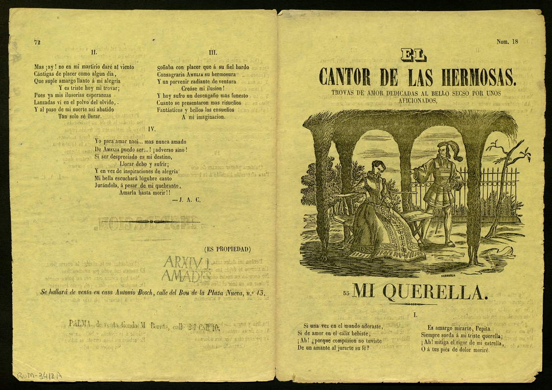 Martí, A.. ([18-) "El Cantor de las hermosas : Trobas de amor dedicadas al bello secso por unos aficionados ; Mi querella ; Delirio ; Inspiracion". Centre de Documentació de Cultura Popular. <http://hdl.handle.net/10687/293092>. [Consulta: ]
