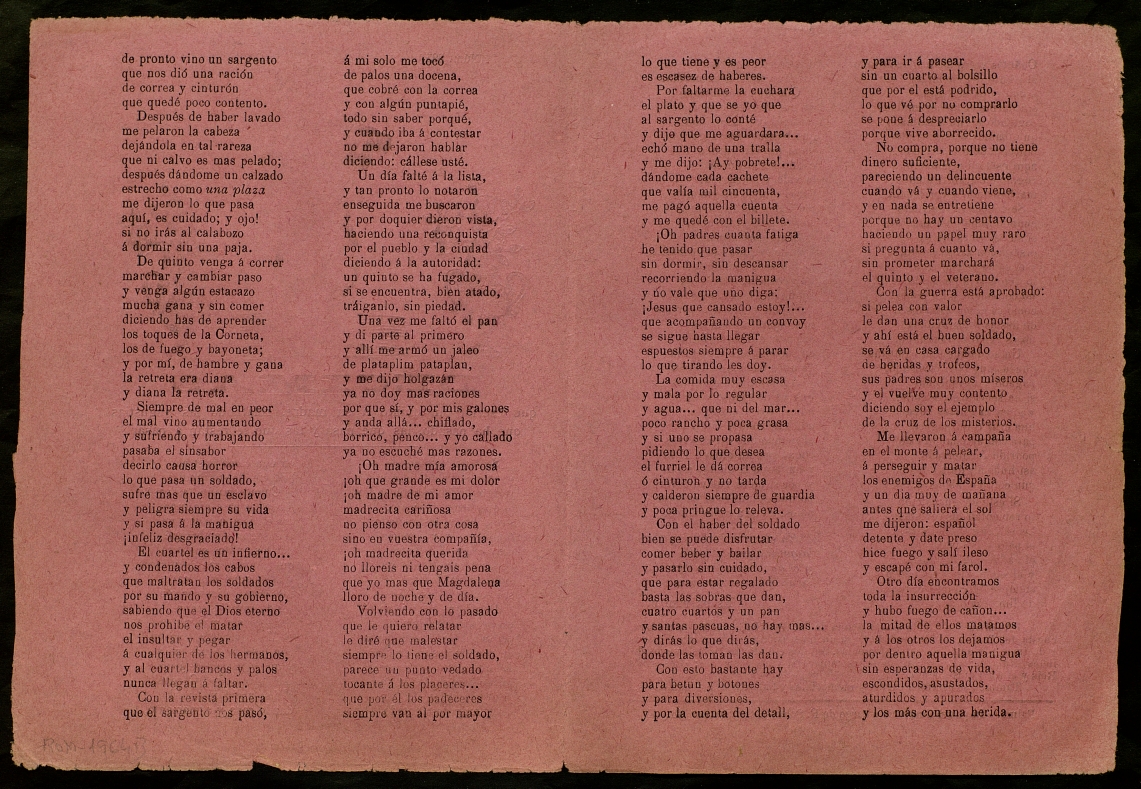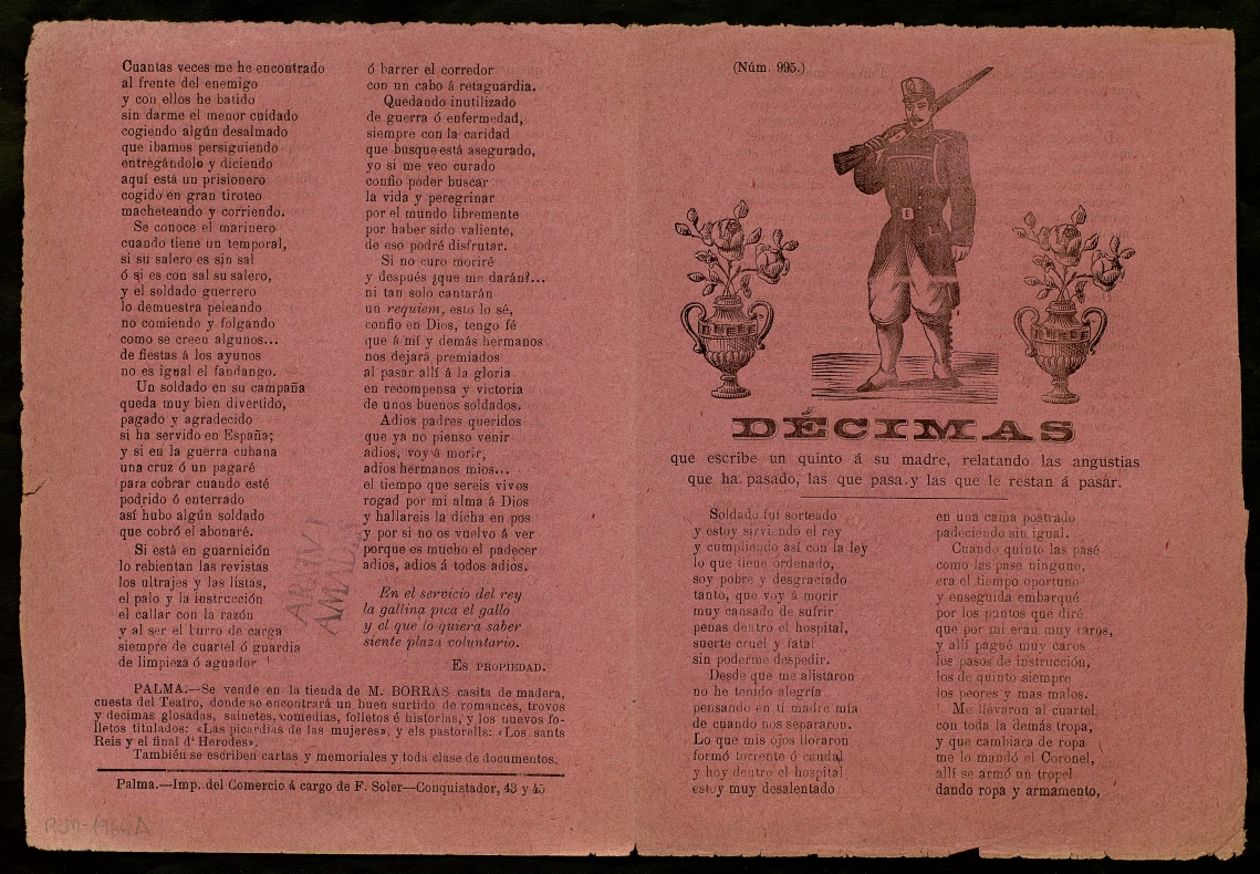 ([18-) "Décimas que escribe un quinto á su madre, relatando las angustias que ha pasado, las que pasa y las que le restan á pasar". Centre de Documentació de Cultura Popular. <http://hdl.handle.net/10687/293119>. [Consulta: ]