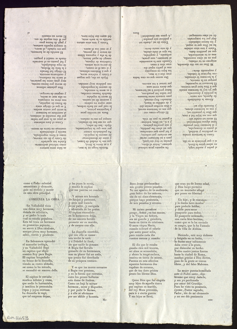 Romanço de gran format. Tres gravats xilogràfics a la capçalera. Text a dues columnes. Estat de conservació bo. Paper de fil.
