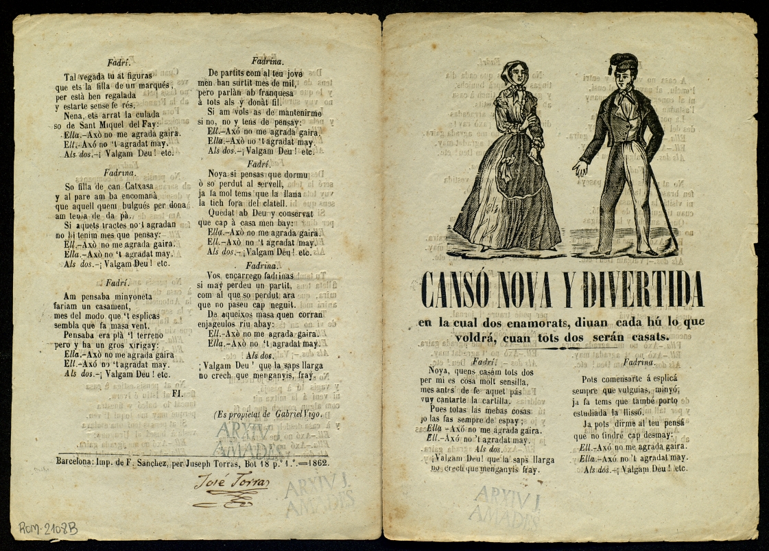(1862) "Cansó nova y divertida : en la cual dos enamorats, diuan cada hú lo que voldrá, cuan tots dos serán casats". Centre de Documentació de Cultura Popular. <http://hdl.handle.net/10687/293316>. [Consulta: ]