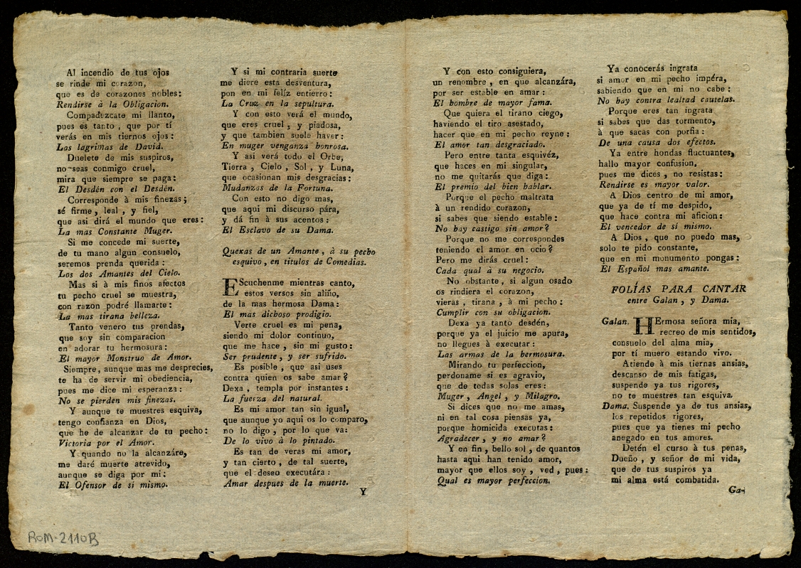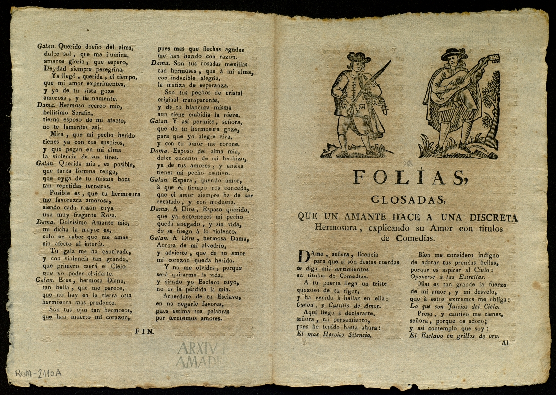 ([18-) "Folias, glosadas : que un amante hace a una discreta Hermosura, explicando su Amor con titulos de Comedias ; Folias para cantar entre Galan y Dama". Centre de Documentació de Cultura Popular. <http://hdl.handle.net/10687/293318>. [Consulta: ]