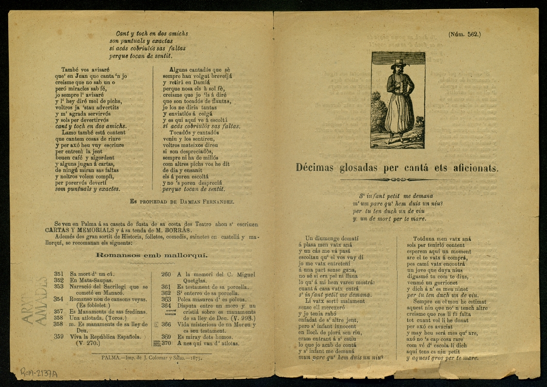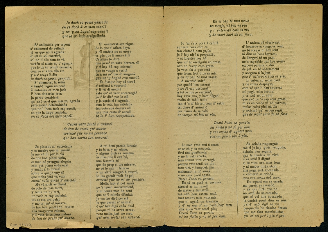 Petit gravat xilogràfic a la capçalera emmarcat dins d'una vinyeta. Text a dues columnes separades per corondell. Ornamentació sota el títol. Estat de conservació bo, si bé està acidificat. Paper mecànic.