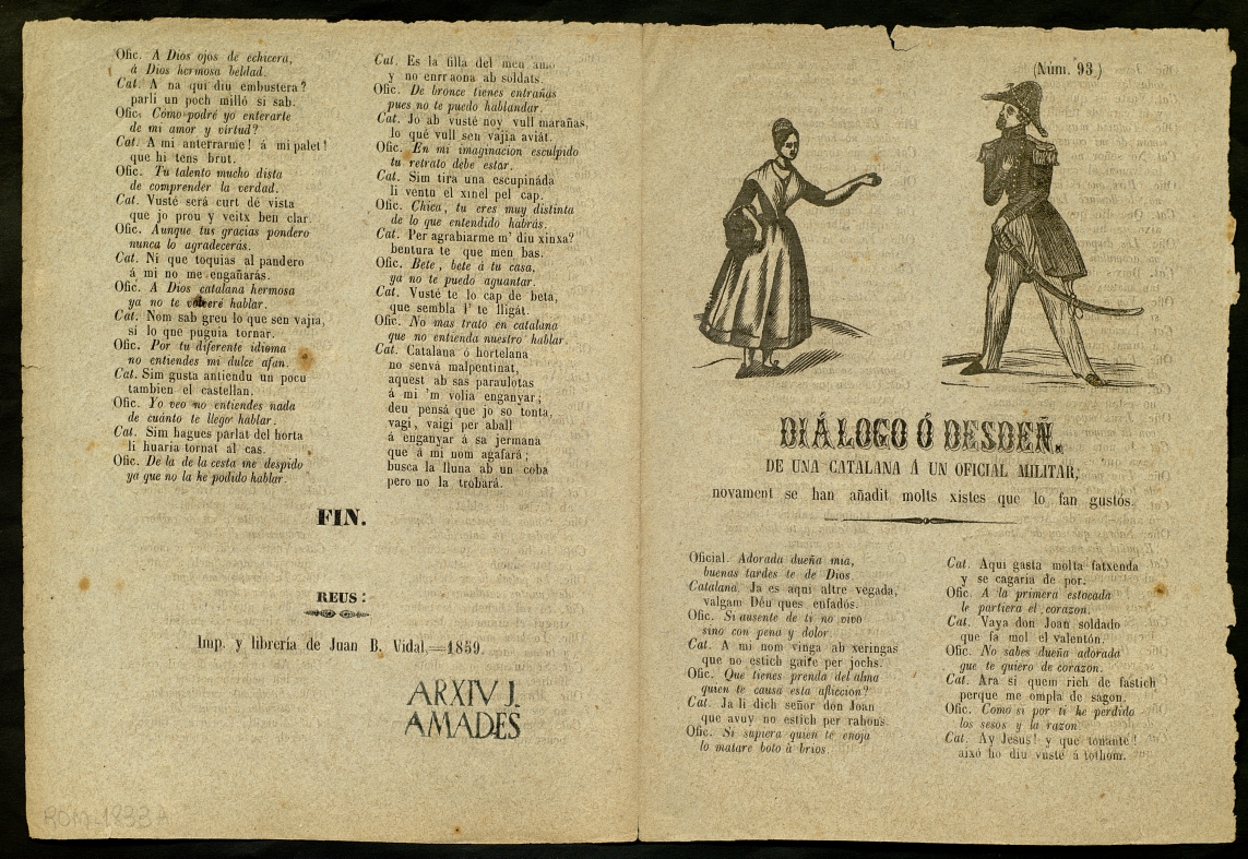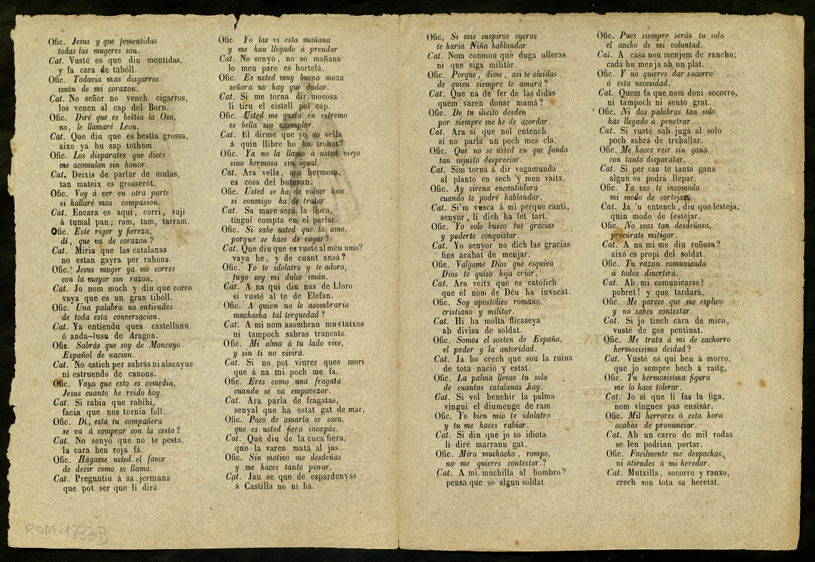 Romanço humorístic dialogat entre dos que festegen, la noia es resisteix a les intencions del noi. Ell parla en castellà i ella en català. La mateixa edició al ROM-1872 i ROM-2387. Una edició similar al ROM-1715, ROM-2194 i ROM-2697.