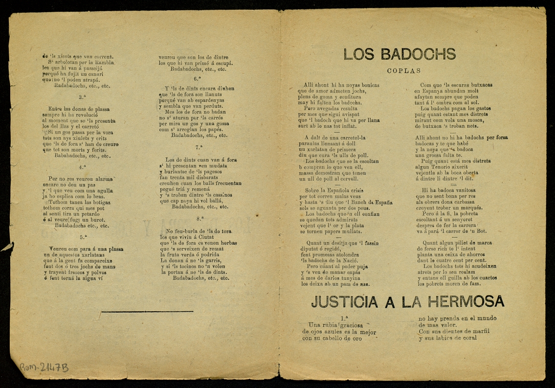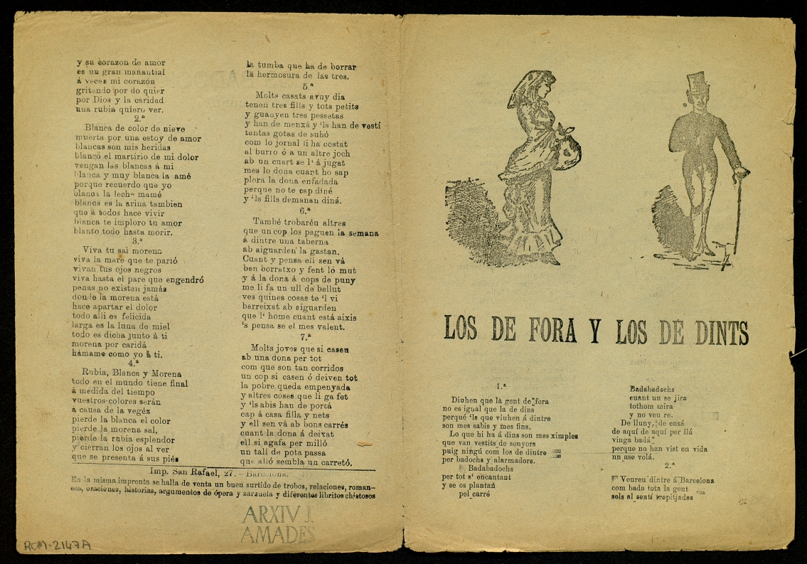 ([18-) "Los de fora y los de dints ; Los badochs ; Justicia a la hermosa". Centre de Documentació de Cultura Popular. <http://hdl.handle.net/10687/293359>. [Consulta: ]