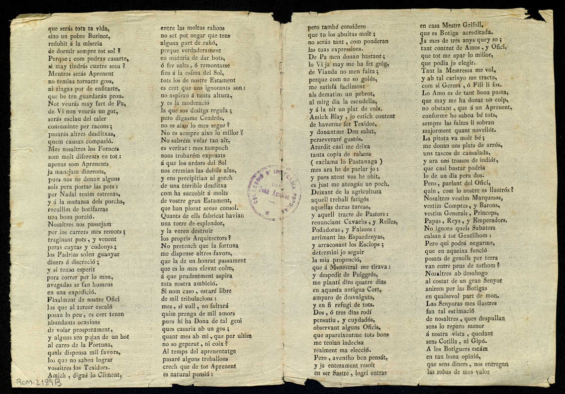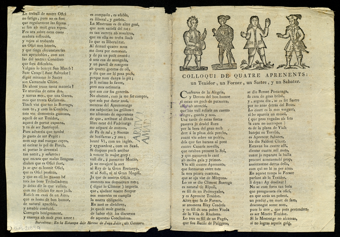 ([18-) "Colloqui de quatre aprenents : un Teixidor, un Forner, un Sastre, y un Sabater". Centre de Documentació de Cultura Popular. <http://hdl.handle.net/10687/293405>. [Consulta: ]