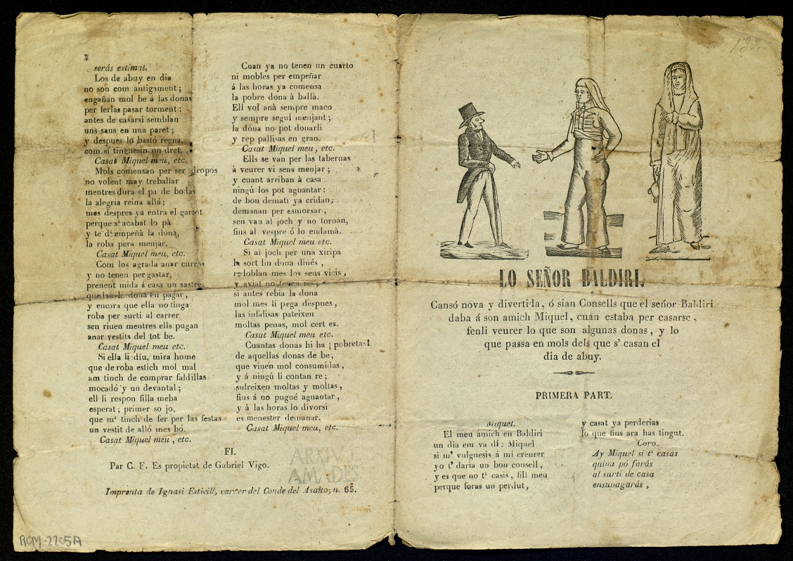 "...cansó nova y divertida, ó sian Consells que el señor Baldiri daba á son amich Miquel, cuan estaba per casarse, fenli veurer lo que son algunas donas, y lo que passa en mols dels que s' casan el dia de abuy"