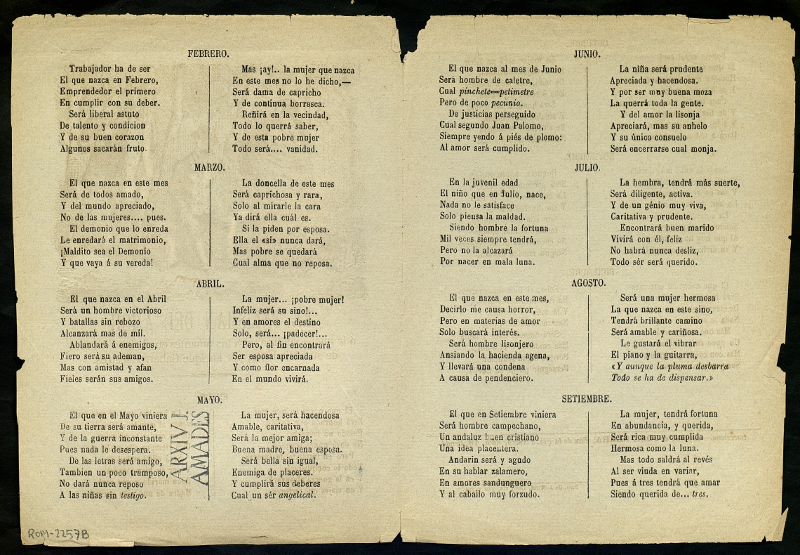 Horòscop o previsions del caràcter i la sort que tindrà cadascú. Hi ha dos paràgrafs per cada mes, el de l'esquerra és per als homes i el de la dreta per les dones. Una edició similar al ROM-0924, ROM-1904, ROM-2218 i ROM-2258.
