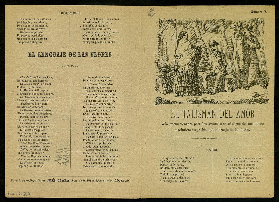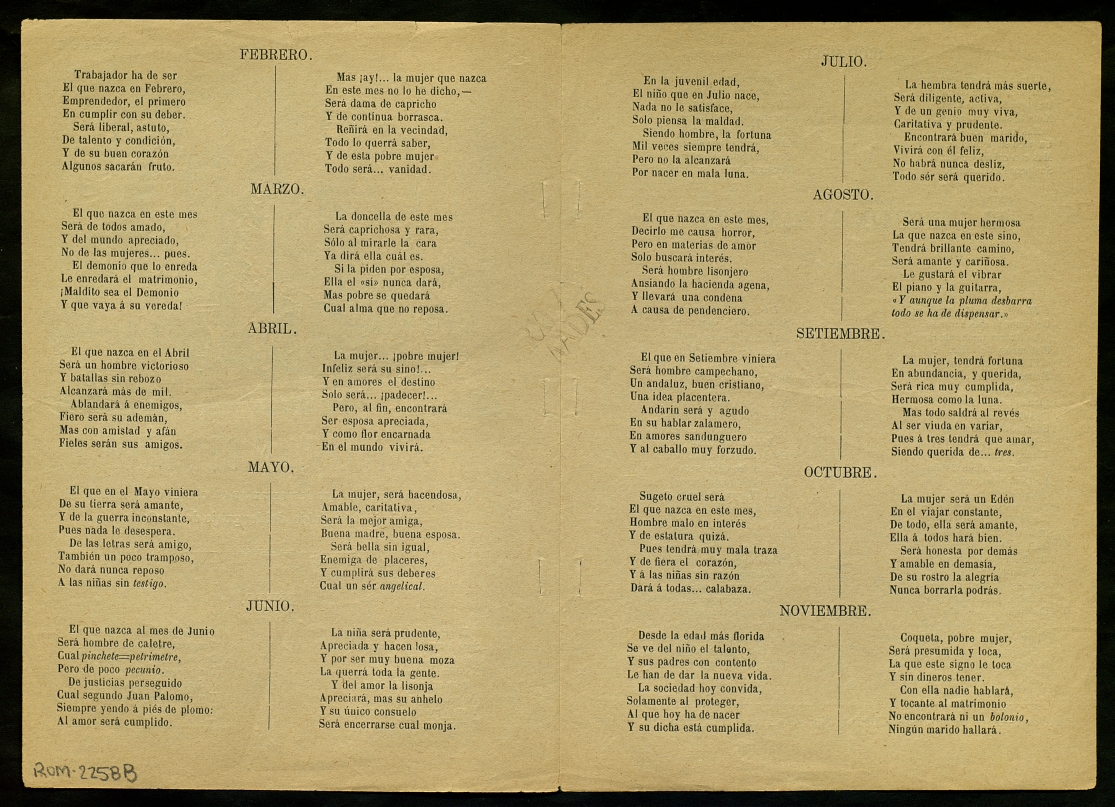 Horòscop o previsions del caràcter i la sort que tindrà cadascú. Hi ha dos paràgrafs per cada mes, el de l'esquerra és per als homes i el de la dreta per les dones. Una edició similar al ROM-0924, ROM-1904, ROM-2218 i ROM-2257. També una cançó de temàtica amorosa.