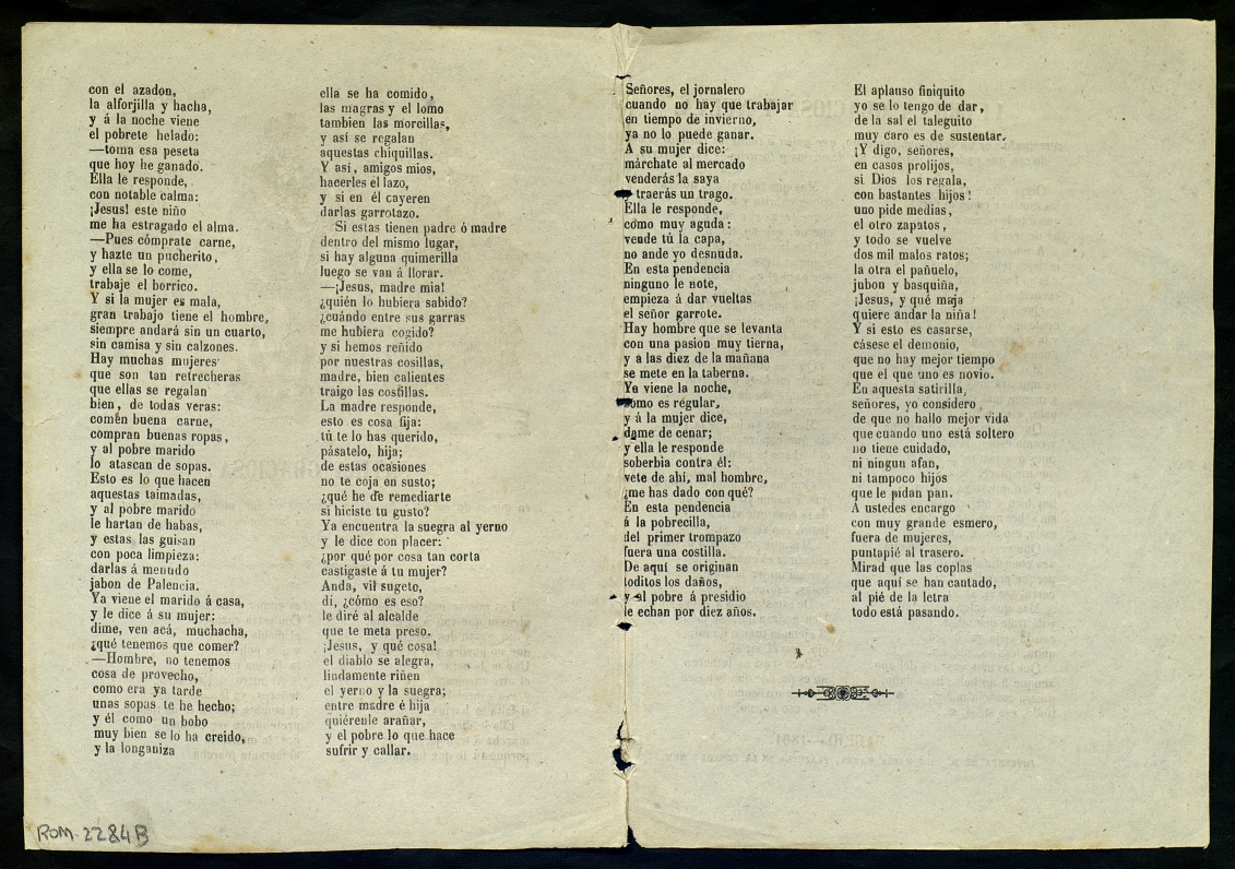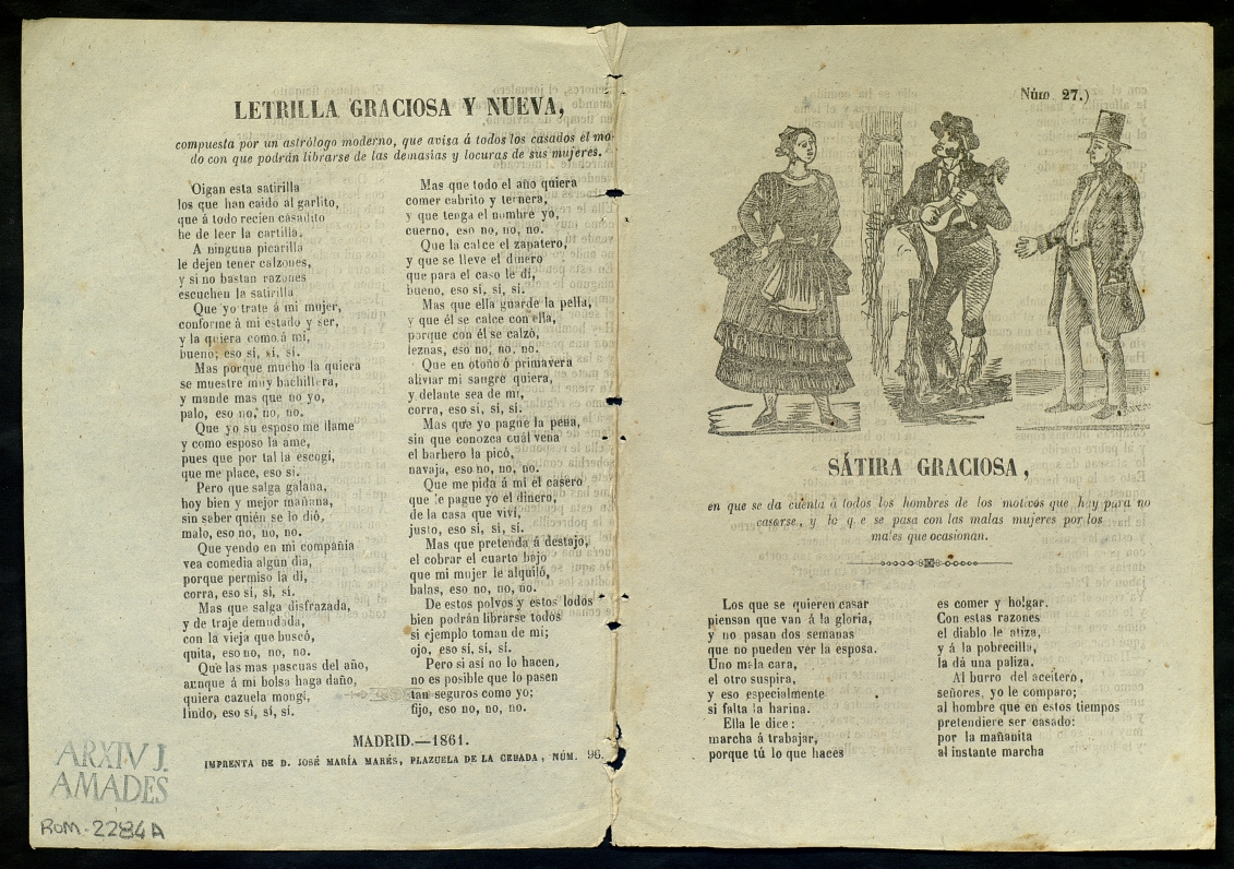 (1861) "Sátira graciosa : en la que se da cuenta á todos los hombres de los motivos que hay para no casarse, y lo que pasa con las malas mujeres por los males que ocasionan ; Letrilla graciosa y nueva". Centre de Documentació de Cultura Popular. <http://hdl.handle.net/10687/293511>. [Consulta: ]
