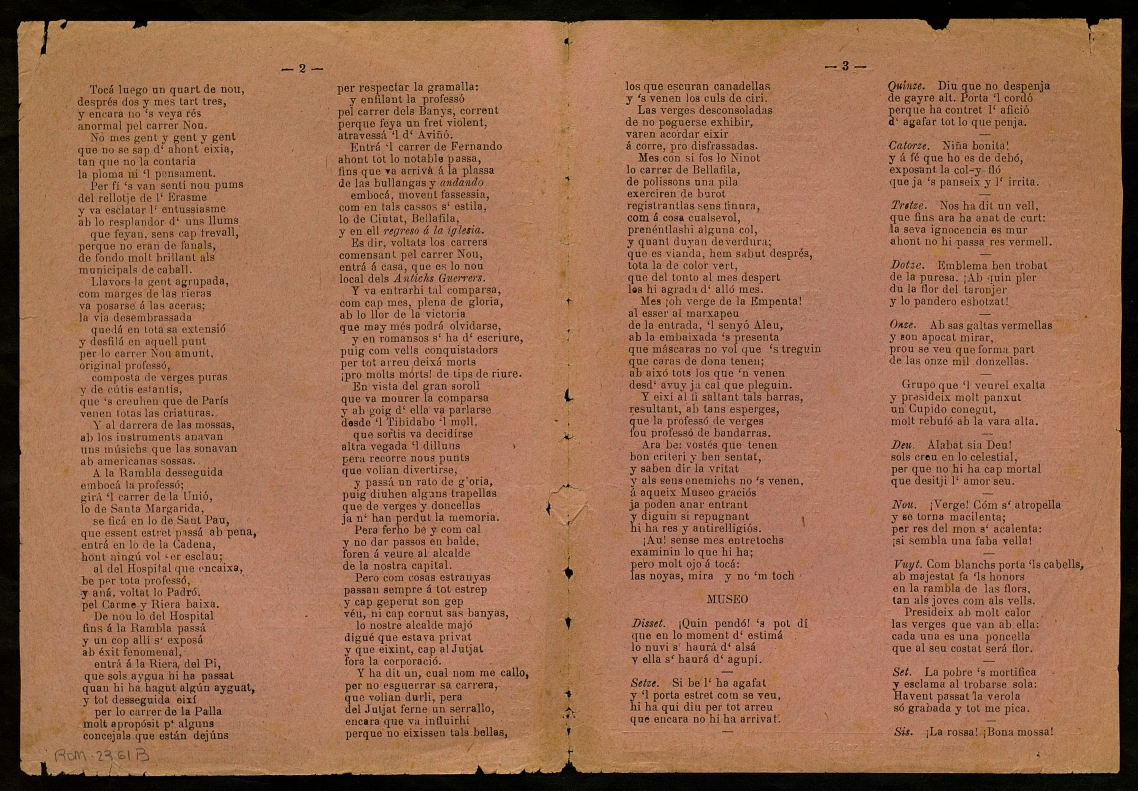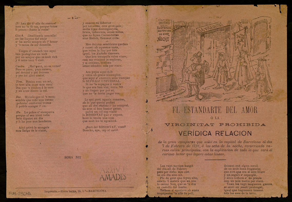 "Verídica relacion de la gran comparsa que salió en la capital de Barcelona el dia 7 de Febrero de 1891, á las ocho de la noche, recorriendo varias calles principales, con la esplicacion de todo lo que verá el curioso lector que leyere estas lineas"