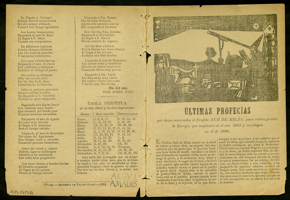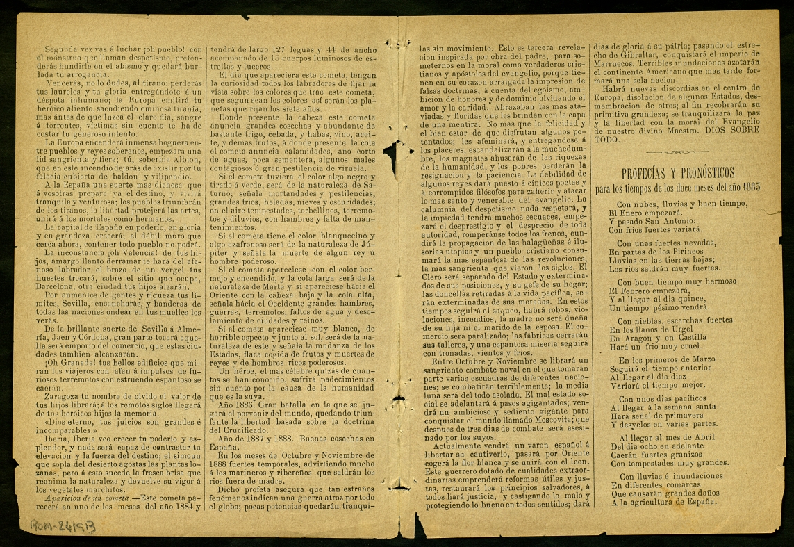 (1884) "Últimas profecías… ; Profecías y pronósticos para los tiempos de los doce meses del año 1883". Centre de Documentació de Cultura Popular. <http://hdl.handle.net/10687/293661>. [Consulta: ]