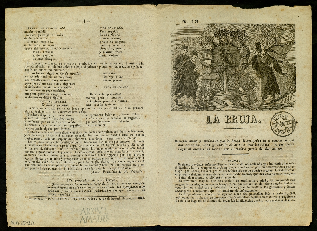 "Romance nuevo y curioso en que la Bruja Marizápalos dá á conocer á sus dos protegidos Blás y Antolin el arte de tirar las cartas, lo que puede llegar al alcance de todos: por el módico precio de dos cuartos". Aquest romanço pertany a una sèrie. Altres números de la mateixa sèrie al ROM-2518, ROM-2519, ROM-2520, ROM-2521, ROM-2523, ROM-2524 i ROM-2525.
