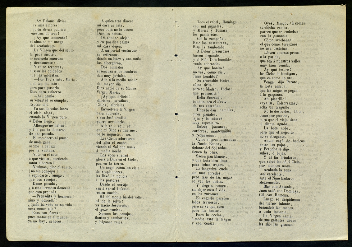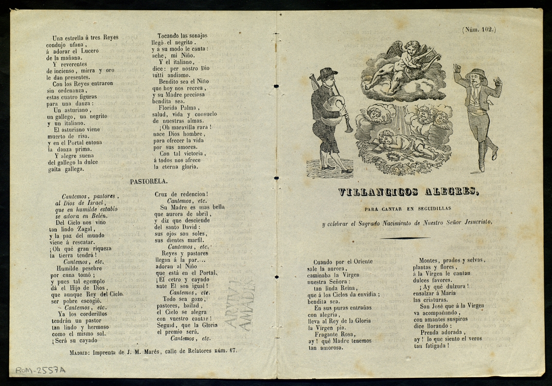 ([18-) "Villancicos alegres : para cantar en seguidillas y celebrar el Sagrado Nacimiento de Nuestro Señor Jesucristo ; Pastorela". Centre de Documentació de Cultura Popular. <http://hdl.handle.net/10687/293813>. [Consulta: ]