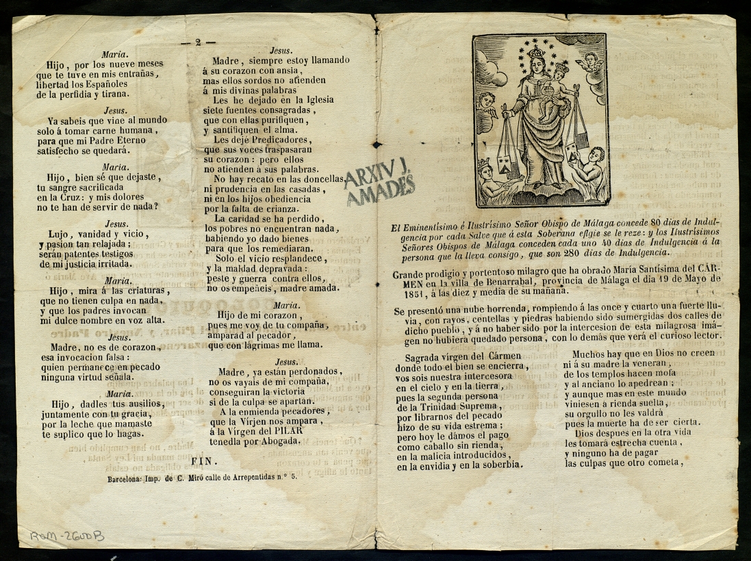 "Verdadero retrato de Maria Santísima del Pilar y Generala de los ejércitos de España: pues por llevarla consigo sus devotos se ha concedido tres mil trescientos cuarenta dias de Indulgencia por varios Señores Arzobispos y Obispos de España é Indias; y á los que devotamente rezaren una Ave Maria ó Salve á esta Soberana Señora poniendo su nombre y apellido"
