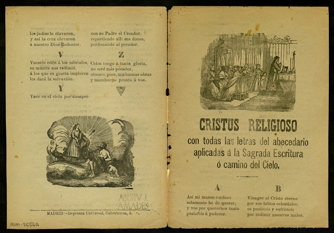 ([18-) "Cristus religioso : con todas las letras del abecedario aplicadas á la Sagrada Escritura ó camino del Cielo". Centre de Documentació de Cultura Popular. <http://hdl.handle.net/10687/293921>. [Consulta: ]