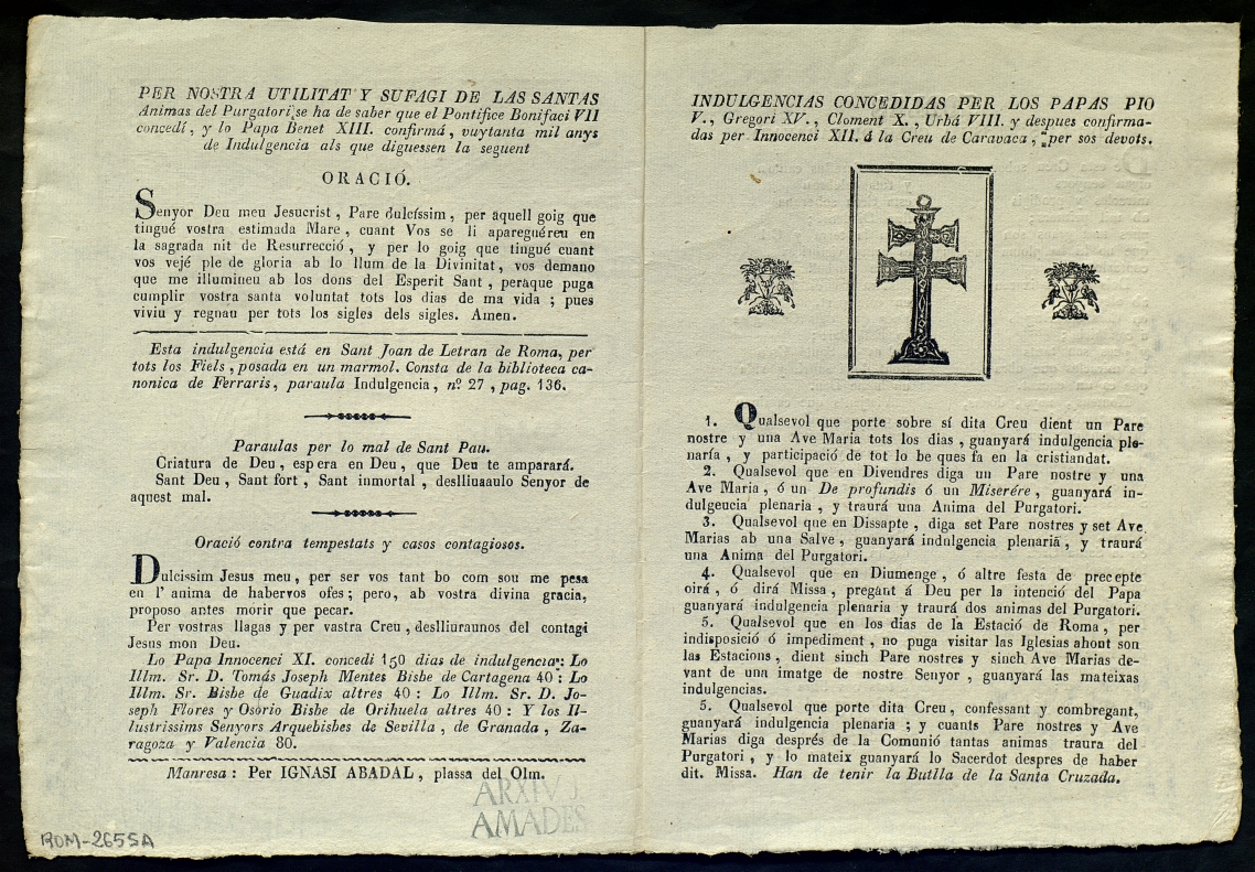 ([18-) "Indulgencias concedidas per los Papas Pio V., Gregori XV., Cloment X., Urbá VIII. y despues confirmadas per Innocenci XII á la Creu de Caravaca, per sos devots ; Coblas de la santissima Creu de Caravaca". Centre de Documentació de Cultura Popular. <http://hdl.handle.net/10687/293922>. [Consulta: ]
