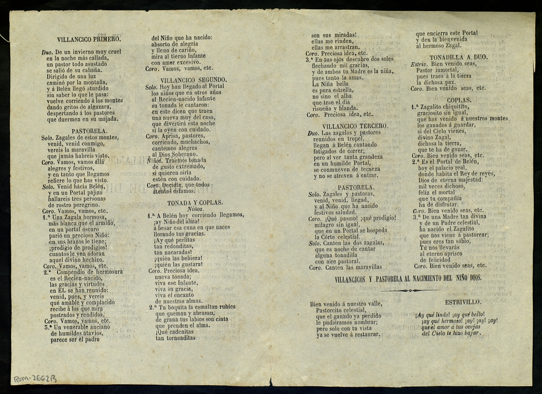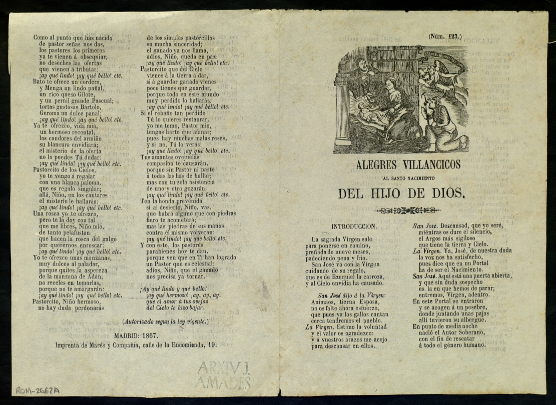(1867) "Alegres villancicos : al santo nacimiento del Hijo de Dios ; Villancicos y pastorela al nacimiento del Niño Dios". Centre de Documentació de Cultura Popular. <http://hdl.handle.net/10687/293929>. [Consulta: ]