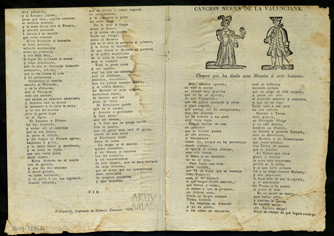 (1847) "Cancion nueva de la valenciana : chasco que ha dado una Manola á siete Galanes". Centre de Documentació de Cultura Popular. <http://hdl.handle.net/10687/293966>. [Consulta: ]