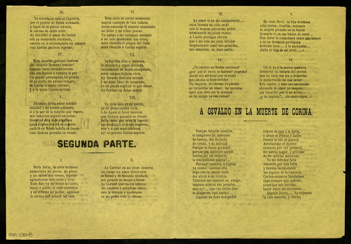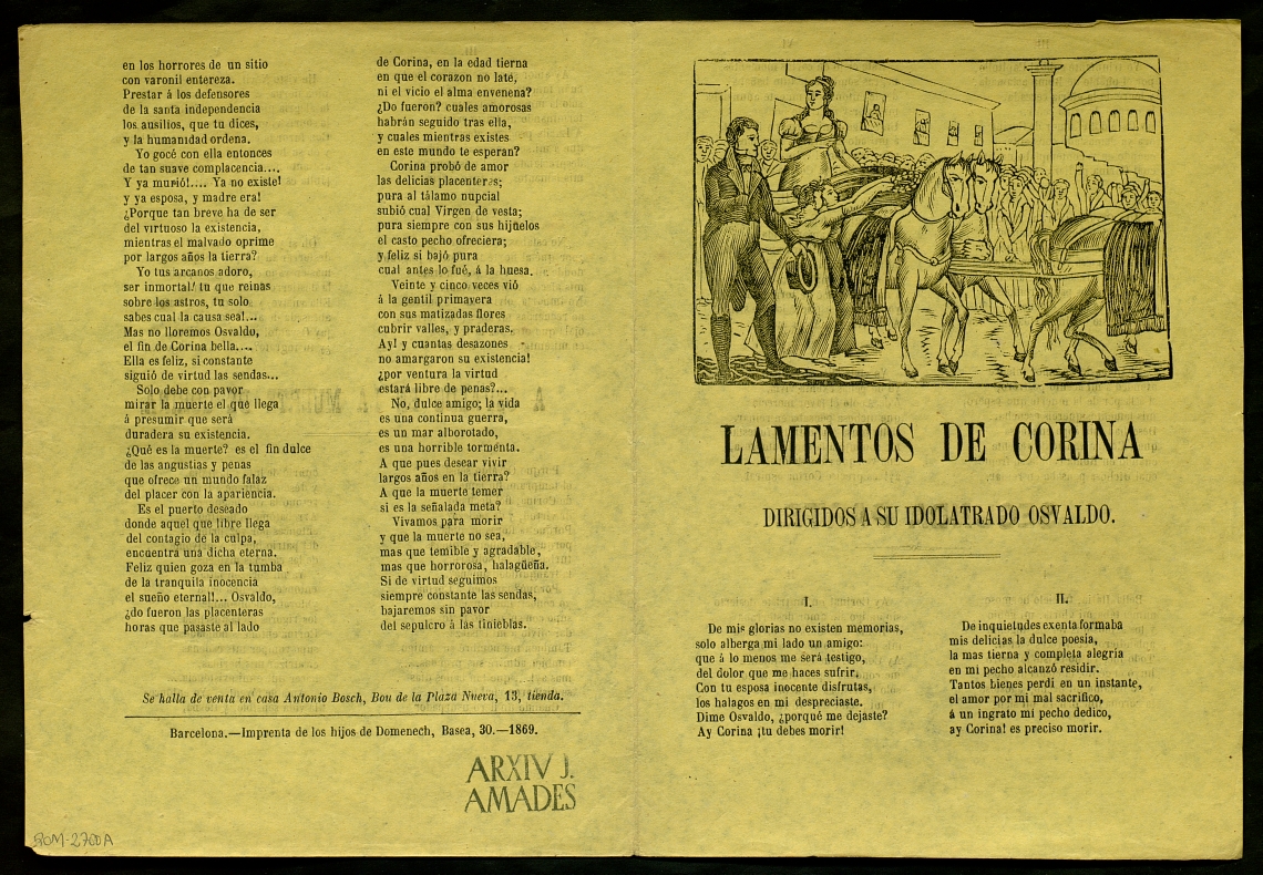 (1869) "Lamentos de Corina : dirigidos a su idolatrado Osvaldo ; Segunda parte : á Osvaldo en la muerte de Corina". Centre de Documentació de Cultura Popular. <http://hdl.handle.net/10687/293971>. [Consulta: ]
