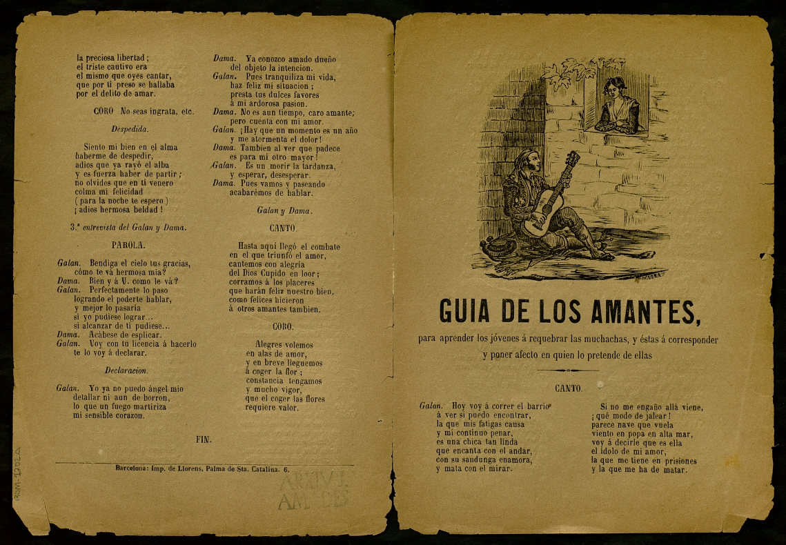 ([18-) "Guia de los amantes : para aprender los jóvenes á requebrar las muchachas, y éstas á corresponder y poner afecto en quien lo pretende de ellas". Centre de Documentació de Cultura Popular. <http://hdl.handle.net/10687/293973>. [Consulta: ]