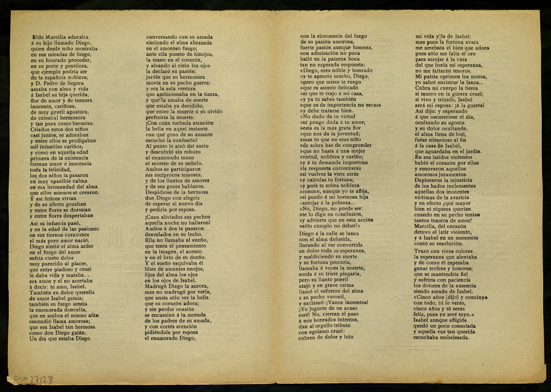 ([18-) "Los amantes de Teruel : nueva relacion histórica y compendiada de los amores y trágico suceso de dichos amantes don Diego de Marcilla y Doña Isabel de Segura : primera parte". Centre de Documentació de Cultura Popular. <http://hdl.handle.net/10687/293985>. [Consulta: ]