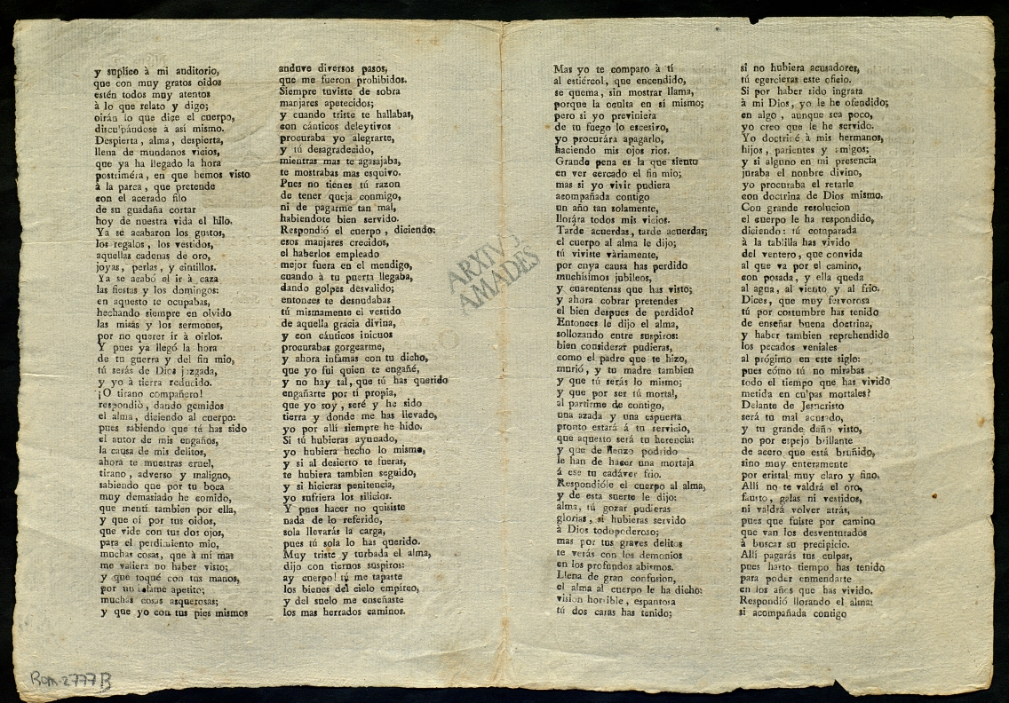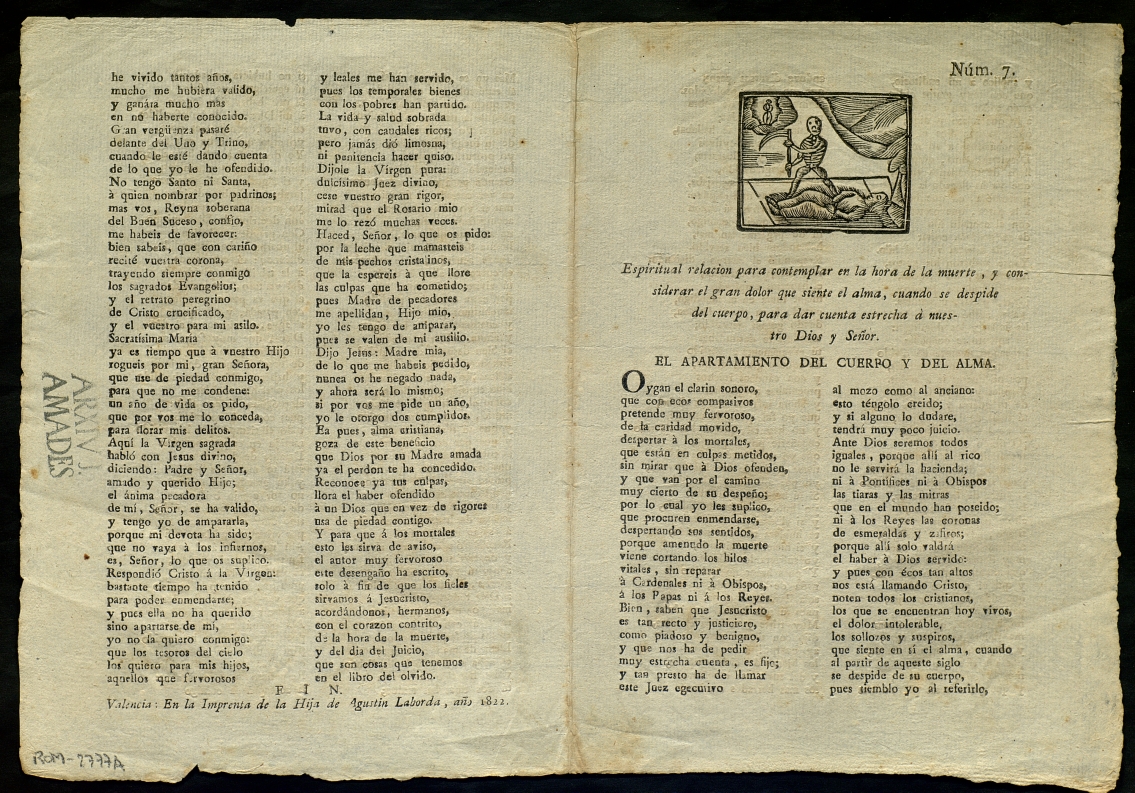 "Espiritual relacion para contemplar en la hora de la muerte, y considerar el gran dolor que siente el alma, cuando se despide del cuerpo, para dar cuenta estrecha à nuestro Dios y Señor". Una edició similar al ROM-2657 i ROM-2658.