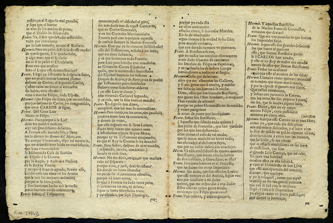 (1707) "Razonamiento jocoso, que tuvo el hermitaño de nuestra Señora del Camino, con un Francès, que passava de retorno para Francia". Centre de Documentació de Cultura Popular. <http://hdl.handle.net/10687/294065>. [Consulta: ]