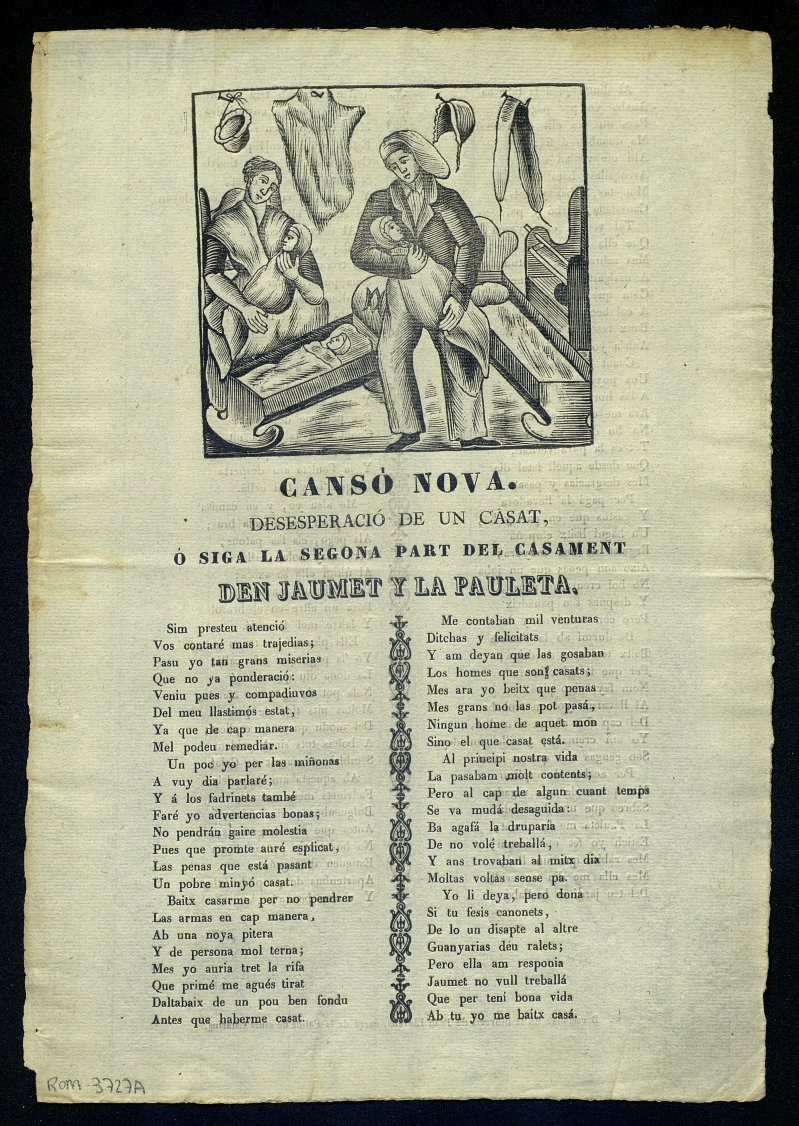 ([18-) "Canso nova : desesperació de un casat, ó siga la segona part del casament den Jaumet y la Pauleta". Centre de Documentació de Cultura Popular. <http://hdl.handle.net/10687/297325>. [Consulta: ]