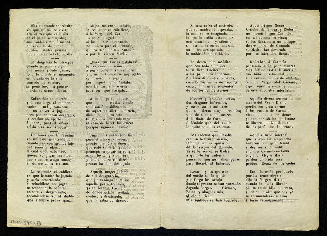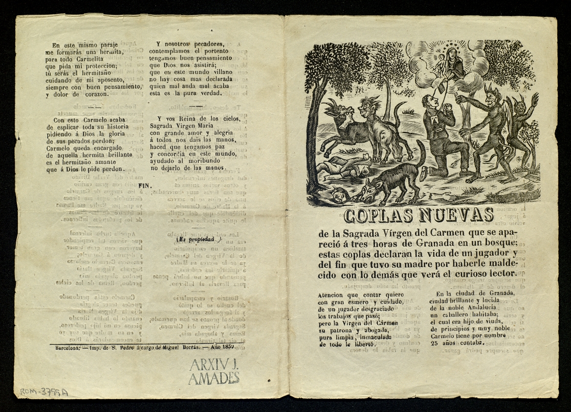 (1859) "Coplas nuevas de la Sagrada Vírgen del Carmen que se apareció á tres horas de Granada en un bosque; ...". Centre de Documentació de Cultura Popular. <