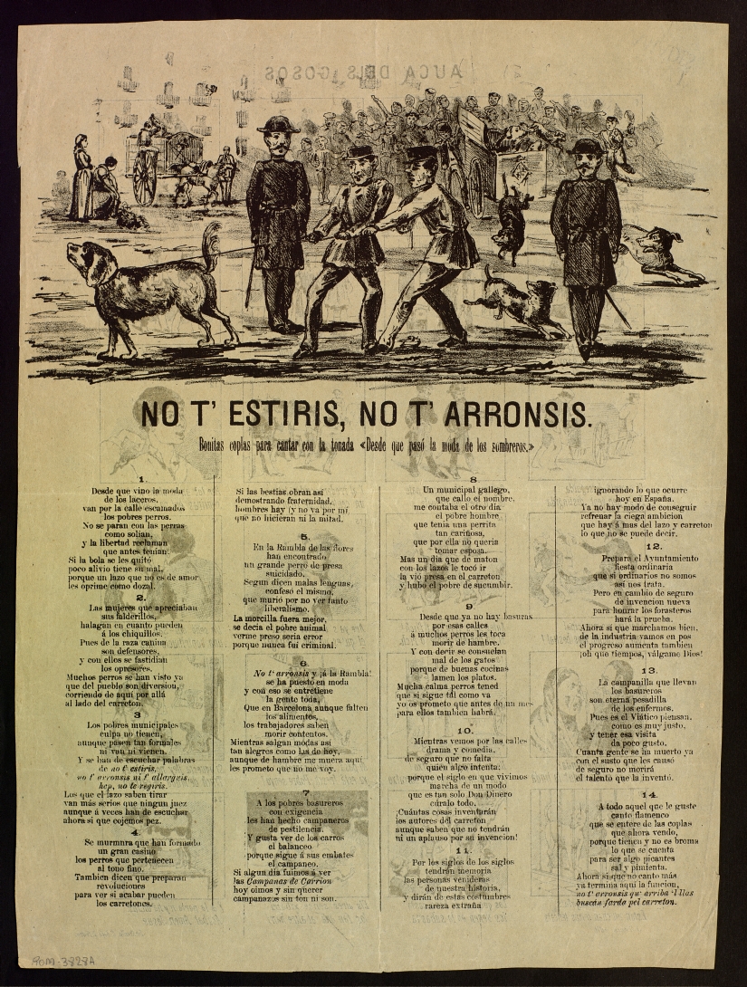 ([18-) "No t'estiris, no t'arronsis : bonitas coplas para cantar con la tonada "Desde que pasó la moda de los sombreros" ; Auca dels gossos". Centre de Documentació de Cultura Popular. <http://hdl.handle.net/10687/297437>. [Consulta: ]
