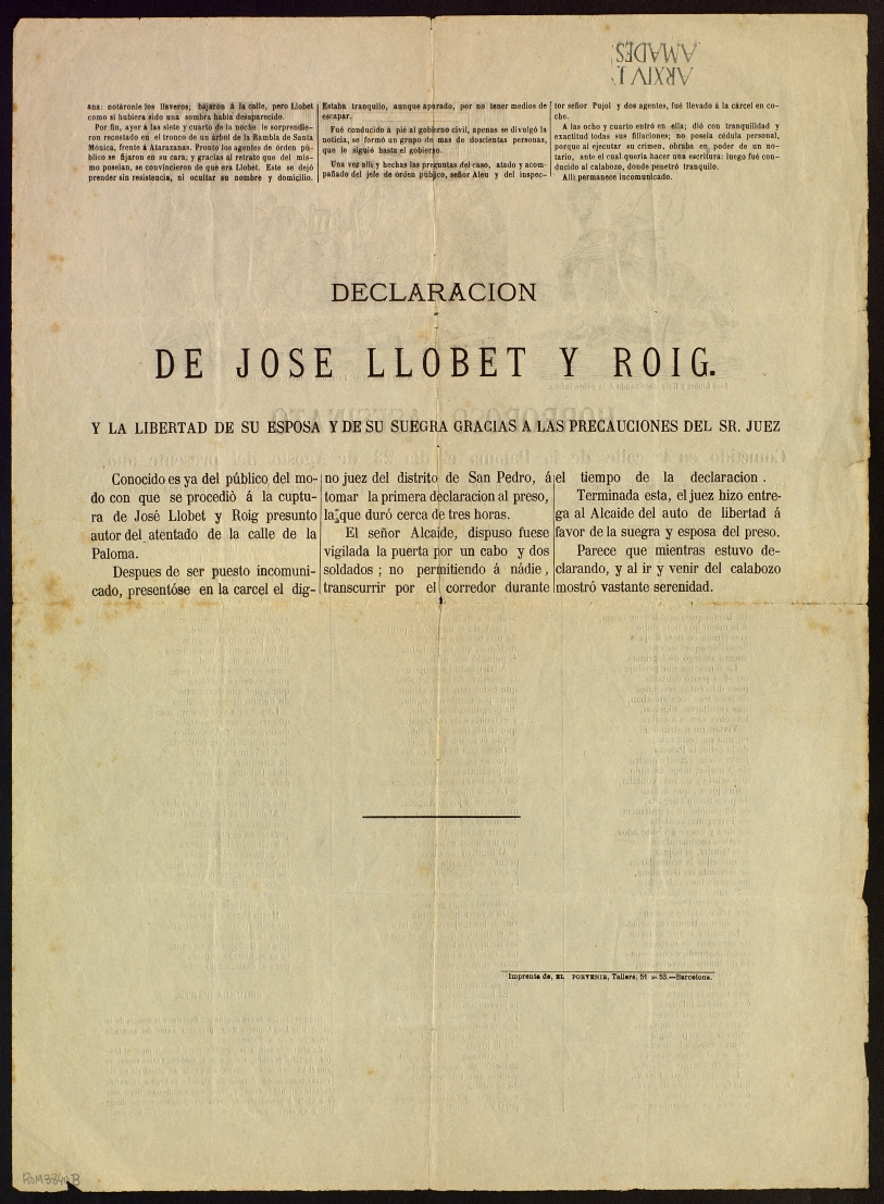 ([18-) "Horroroso asesinato : cometido en la calle de la Paloma el dia 23 de Agosto del presente año ... ; Declaracion de Jose Llobet y Roig ...". Centre de Documentació de Cultura Popular. <http://hdl.handle.net/10687/297450>. [Consulta: ]