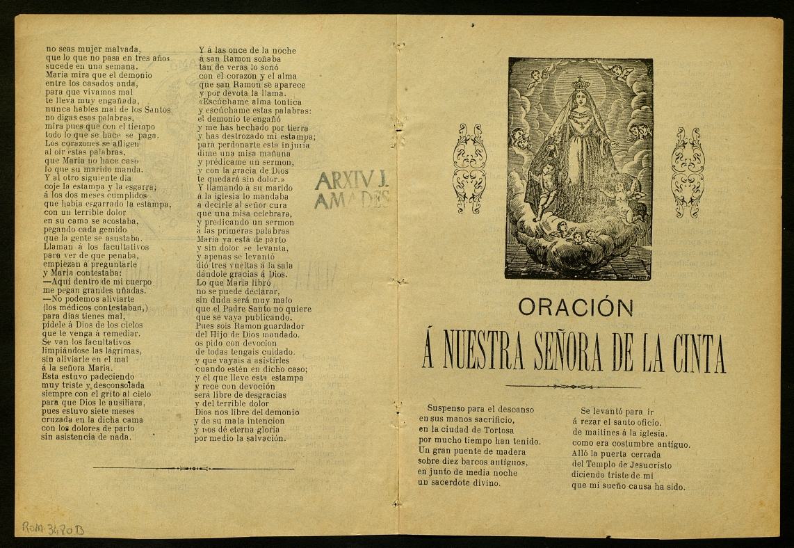 Història d'una dona recén casada, devota de Sant Ramon, que enfurismada per no quedar-se prenyada, destrossa una estampa del sant. Com a càstig comença a patir un dolor durant mesos fins que finalment, després d'una aparició de Sant Ramon, diu una missa al sant, predica un sermó i li marxa el dolor per acabar anant de part. Oració a Santa Cinta.