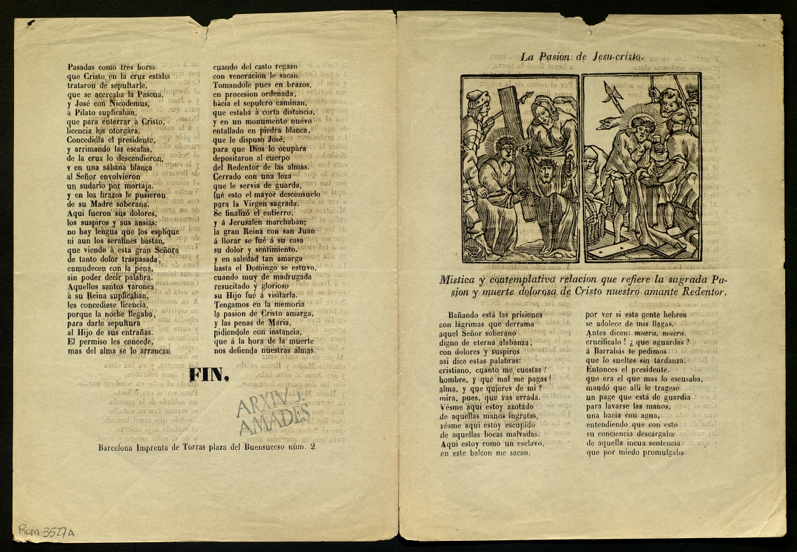 ([18-) "La Pasion de Jesu-cristo : mistica y contemplativa relacion que refiere la sagrada Pasion y muerte dolorosa de Cristo nuestro amante Redentor". Centre de Documentació de Cultura Popular. <http://hdl.handle.net/10687/297613>. [Consulta: ]