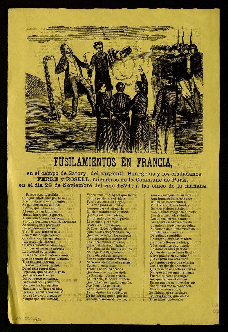 (1871) "Fusilamientos en Francia, en el campo de Satory, del sargento Bourgeois y los ciudadanos FERRE y ROSELL, ...". Centre de Documentació de Cultura Popular. <http://hdl.handle.net/10687/297623>. [Consulta: ]