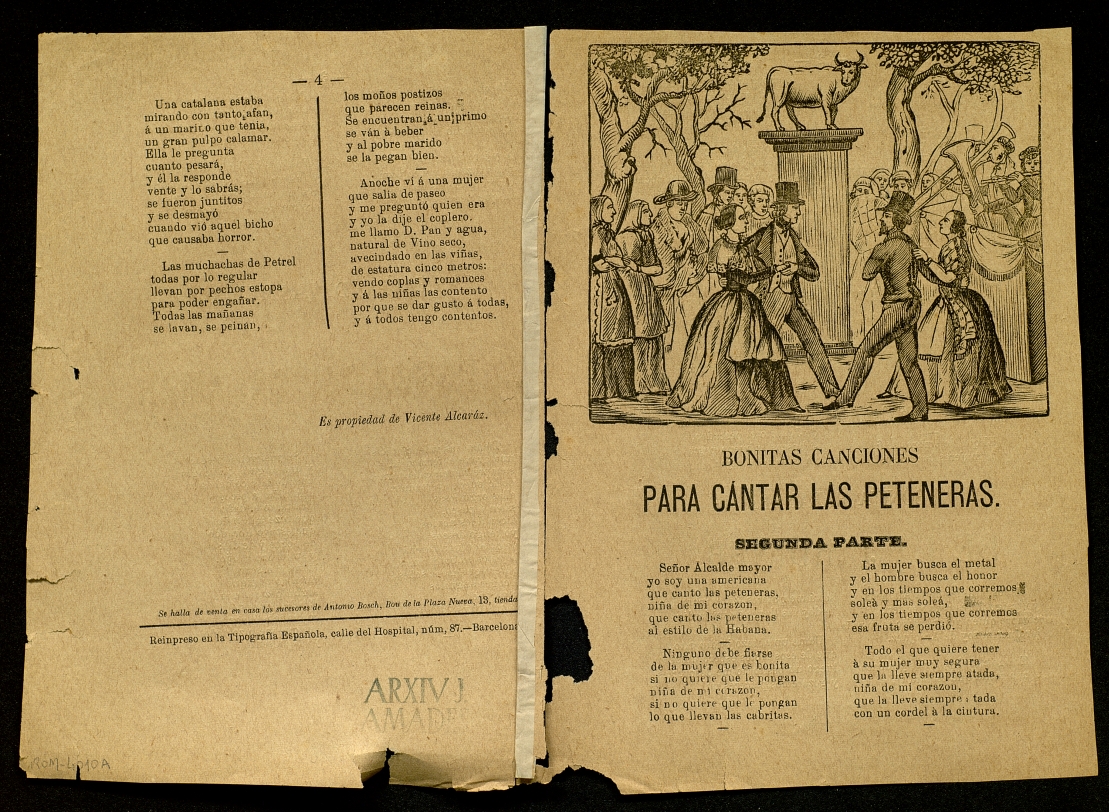 ([18-) "Bonitas canciones para cantar las peteneras : segunda parte ; Bonita habanera de la jardinera ; Las faltas de las mujeres o la pesca del calamar". Centre de Documentació de Cultura Popular. <http://hdl.handle.net/10687/297639>. [Consulta: ]