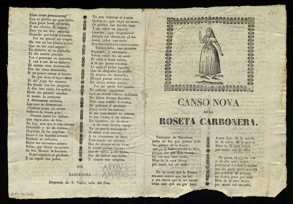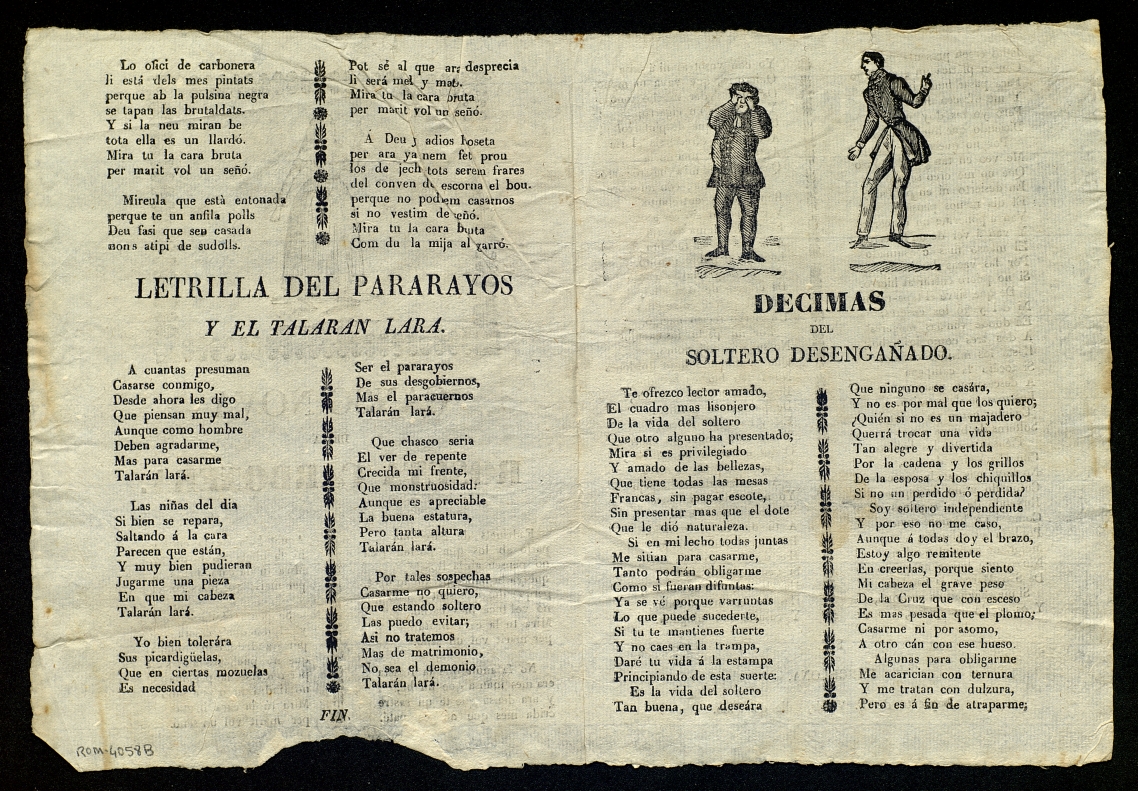 ([18-) "Canso nova de la Roseta Carbonera ; Letrilla del pararayos y el talaran lara ; Decimas del soltero desengañado". Centre de Documentació de Cultura Popular. <http://hdl.handle.net/10687/297692>. [Consulta: ]