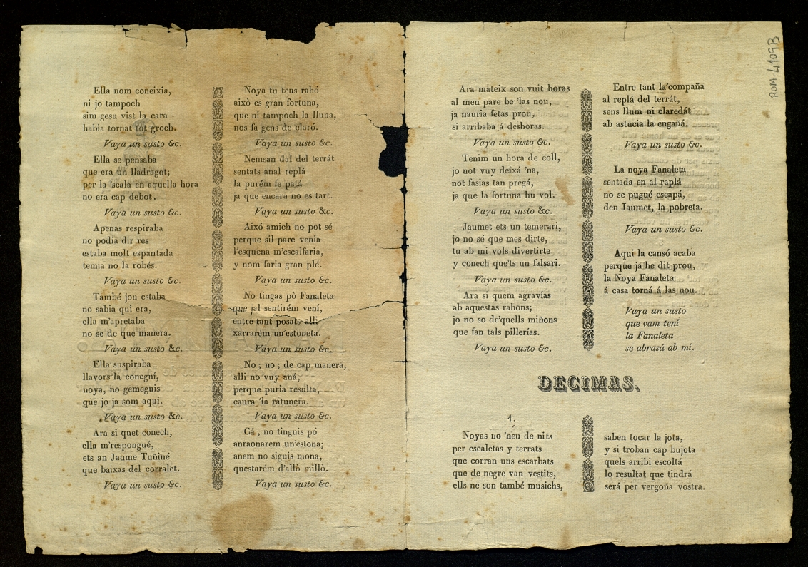 (1847) "La fanaleta : nova i curiosa cansó de la Noya FANALETA que acaba de compondrer un aficionát ... ; Decimas". Centre de Documentació de Cultura Popular. <http://hdl.handle.net/10687/297749>. [Consulta: ]