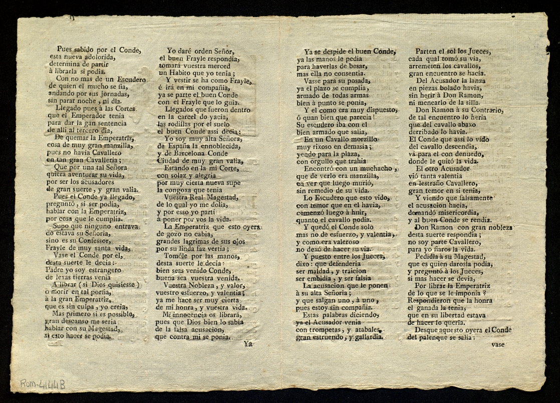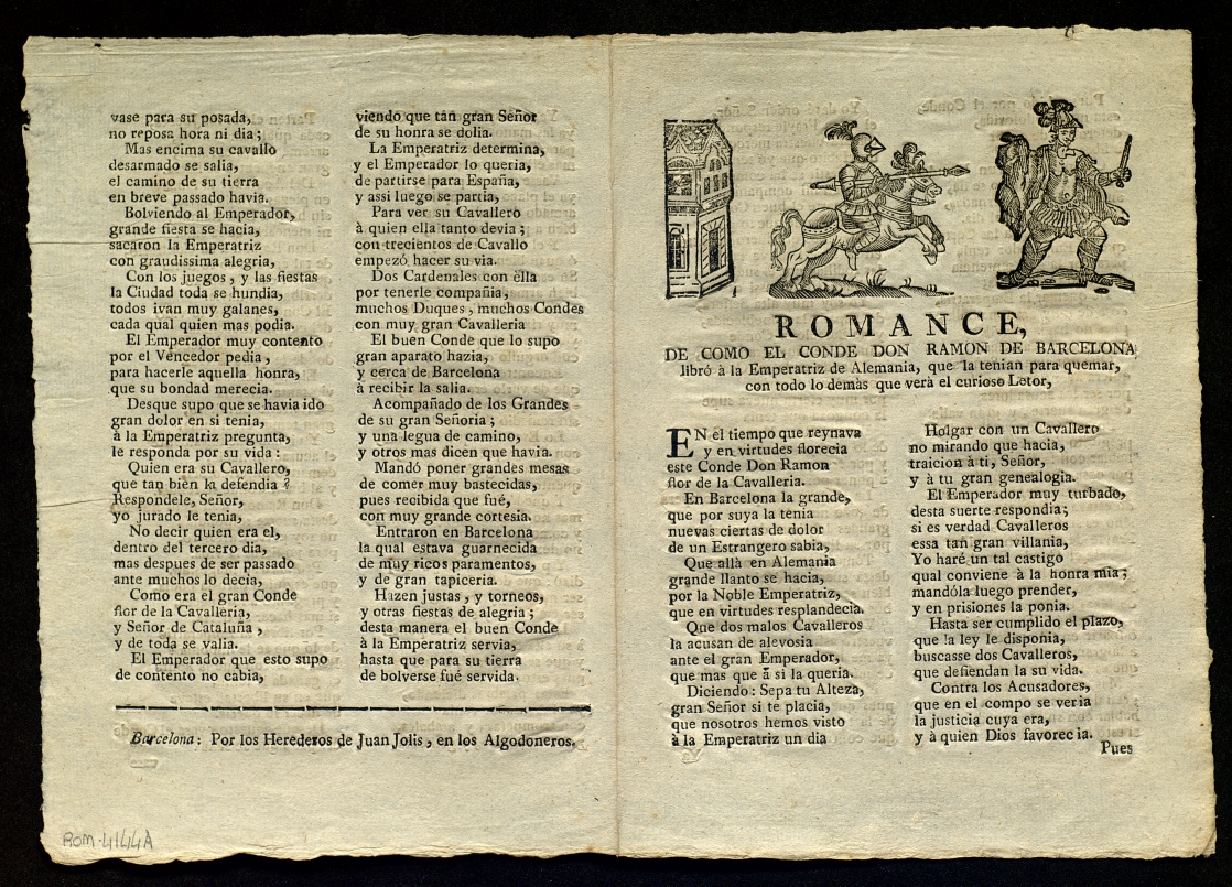 ([18-) "Romance de como el conde don Ramon de Barcelona, libró à la Emperatriz de Alemania, que la tenian que quemar, con todo lo demàs que verà el curioso lector". Centre de Documentació de Cultura Popular. <http://hdl.handle.net/10687/297787>. [Consulta: ]