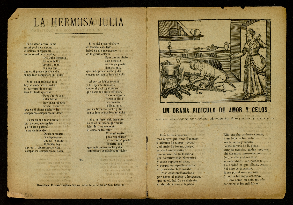 ([18-) "Un drama ridículo de amor y celos entre un caballero y su sirvienta dos gatos y un mico ; Canción de la jalea y amores de una dama con un confitero ; La hermosa Julia". Centre de Documentació de Cultura Popular. <http://hdl.handle.net/10687/297795>. [Consulta: ]