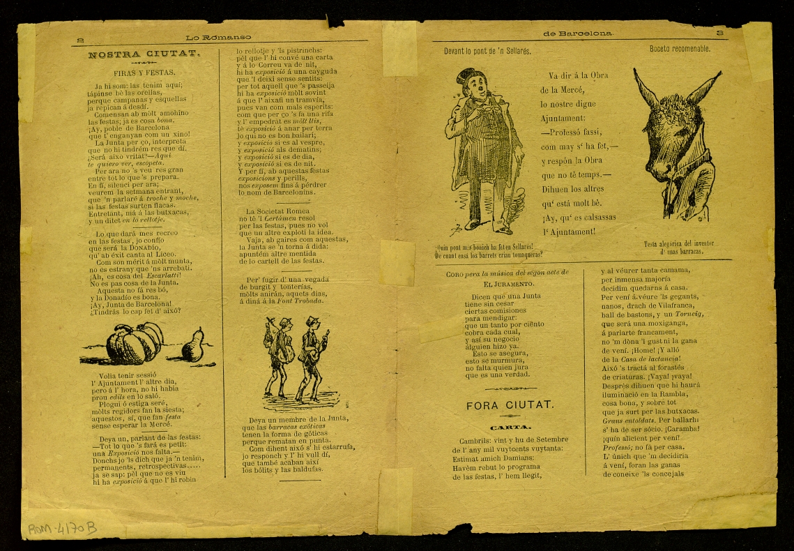 Damians, Domingo. (1880) "Lo romanso de Barcelona : relació verídica de lo ocorregut durant a setmana". Centre de Documentació de Cultura Popular. <http://hdl.handle.net/10687/297816>. [Consulta: ]